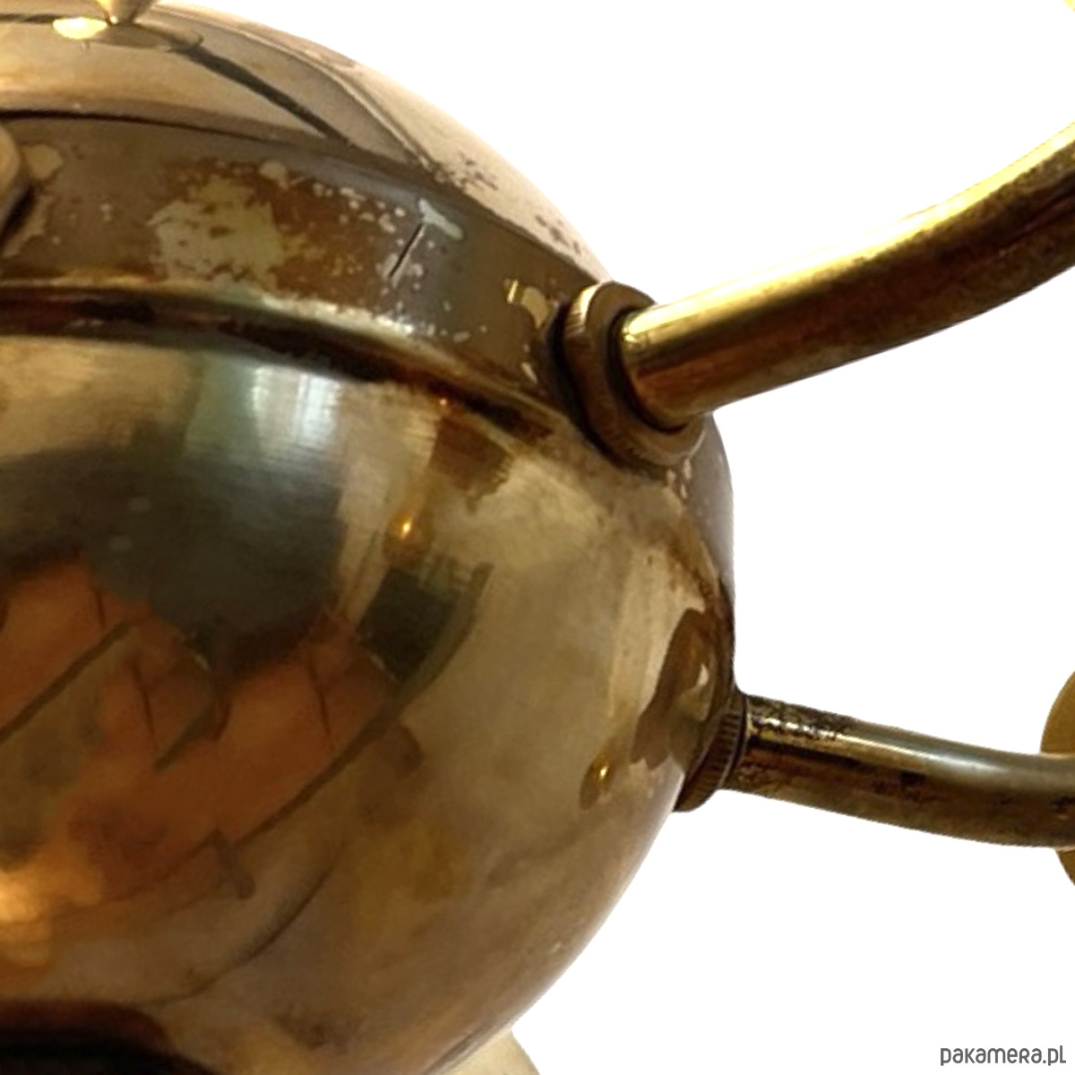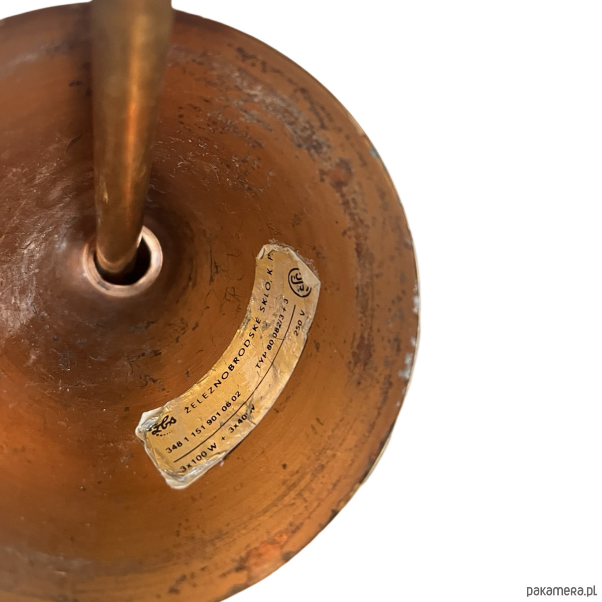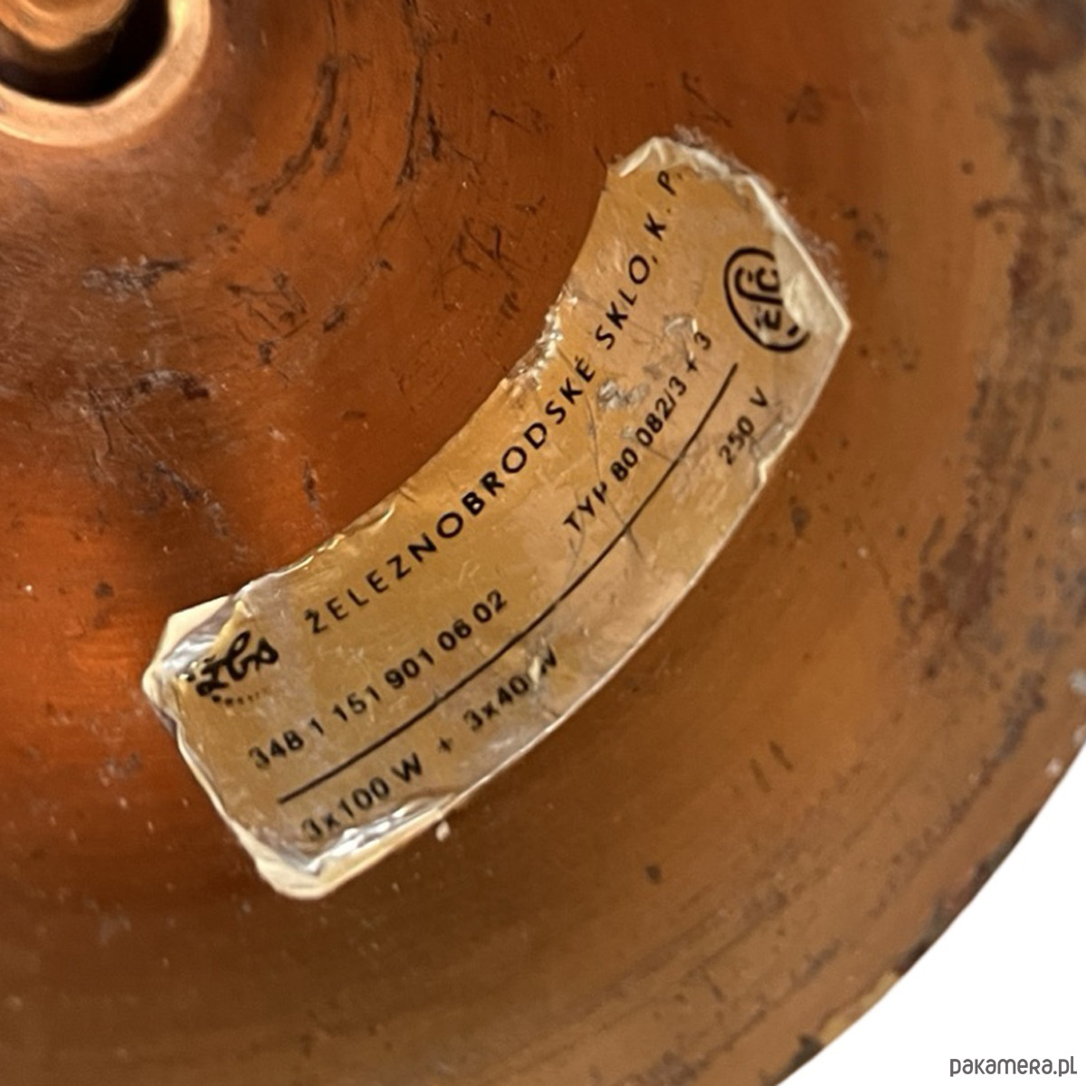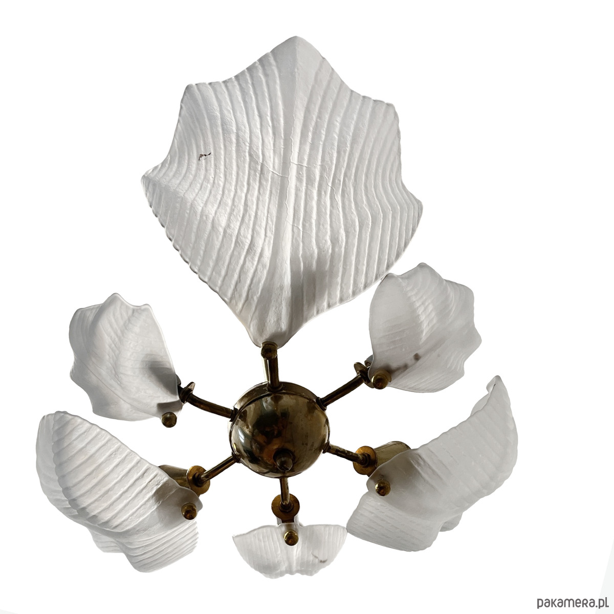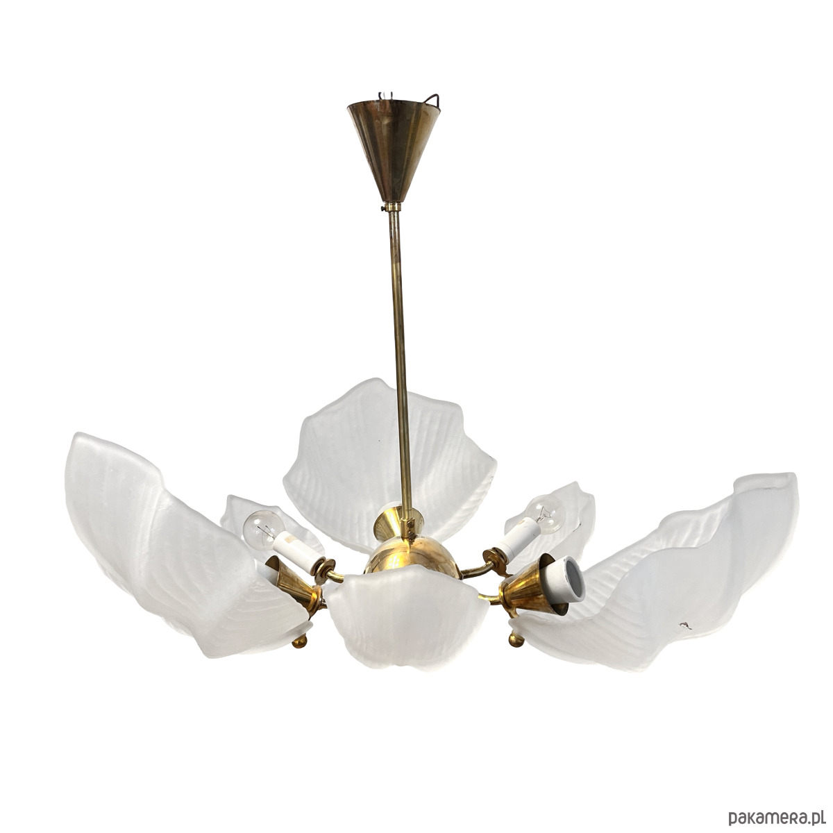 Żyrandol sześcioramienny typ 80082/3+3 w stylu hollywood regency wyprodukowany przez Železny Brod Sklo ZBS n.p. w latach 70. w Czechosłowacji. Lampa wisząca wykonana z polerowanego mosiądzu. Ozdobą żyrandola są piękne, ręcznie wykonane klosze z masywnego szkła o formie inspirowanej liśćmi lub muszlami. Lampa w stanie bardzo dobrym, normalne ślady użytkowania. klosze bez uszkodzeń. Klosze wykonane zostały ze szkła ręcznie formowanego o organicznej strukturze, osłaniają oprawki na żarówkę E27 do 40W - 3 razy oraz E14 - 3 razy.