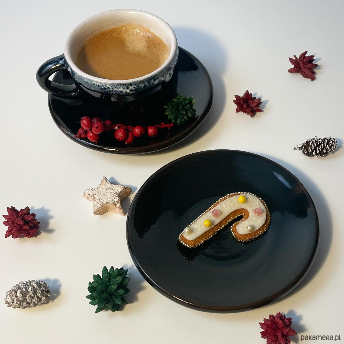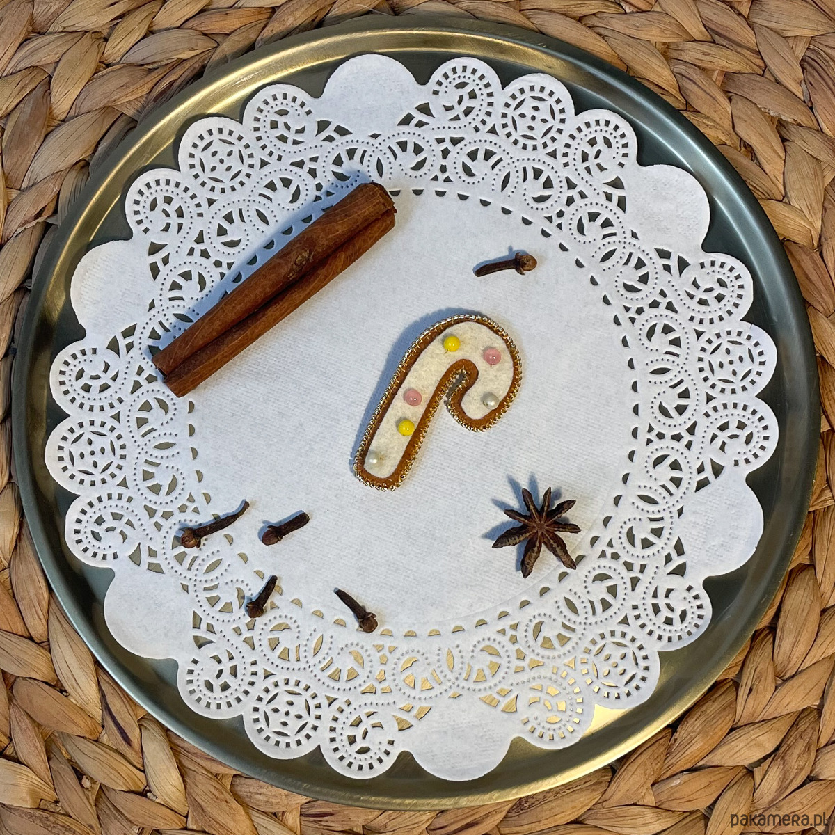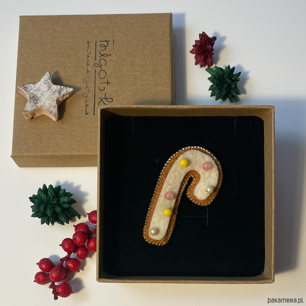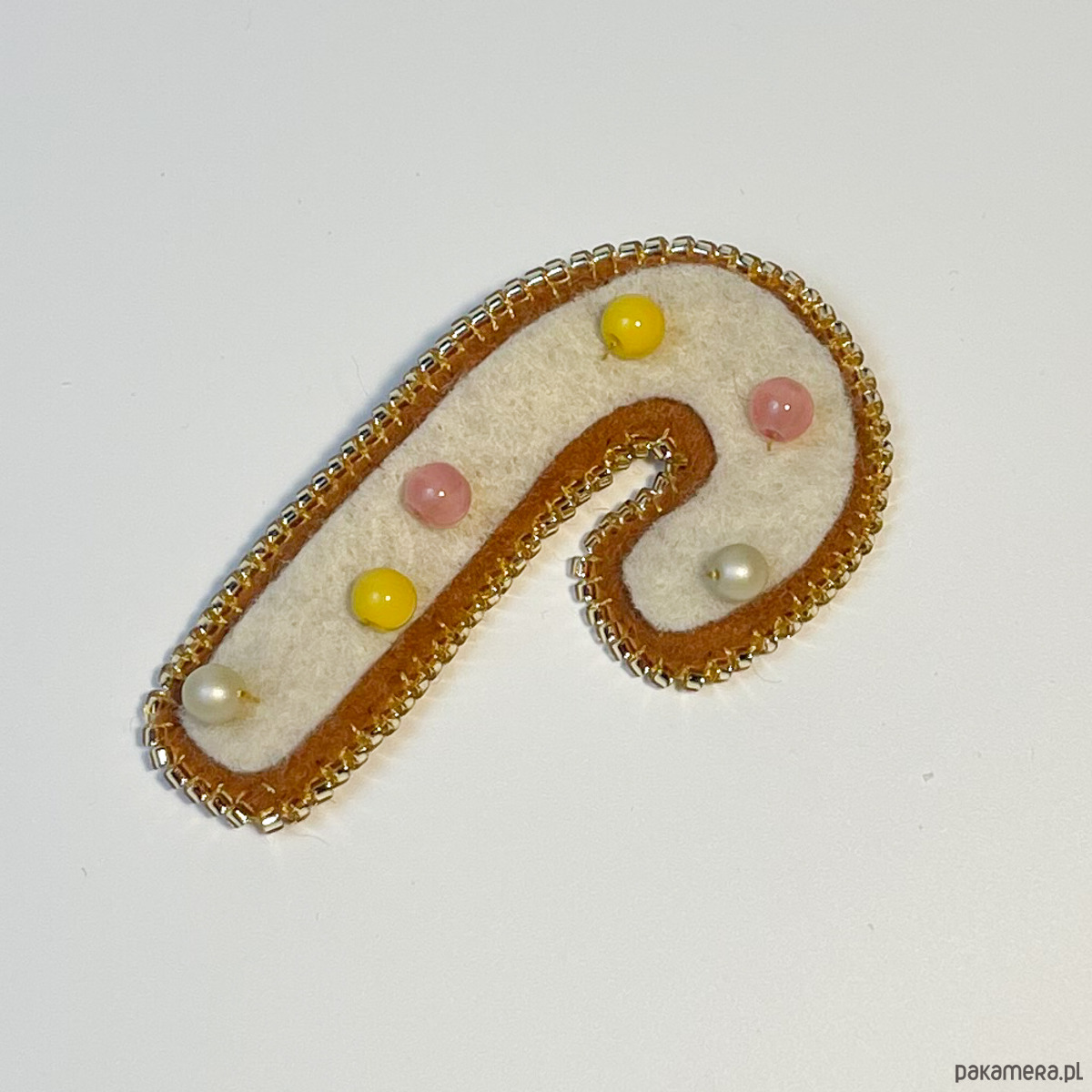 Urocza broszka w kształcie świątecznego pierniczka, wykonana ręcznie z filcu i ozdobiona kolorowymi koralikami, które przypominają lukrowe cukierki. Całość wykończona została złotym obszyciem, które nadaje jej wyjątkowego, ciepłego blasku.