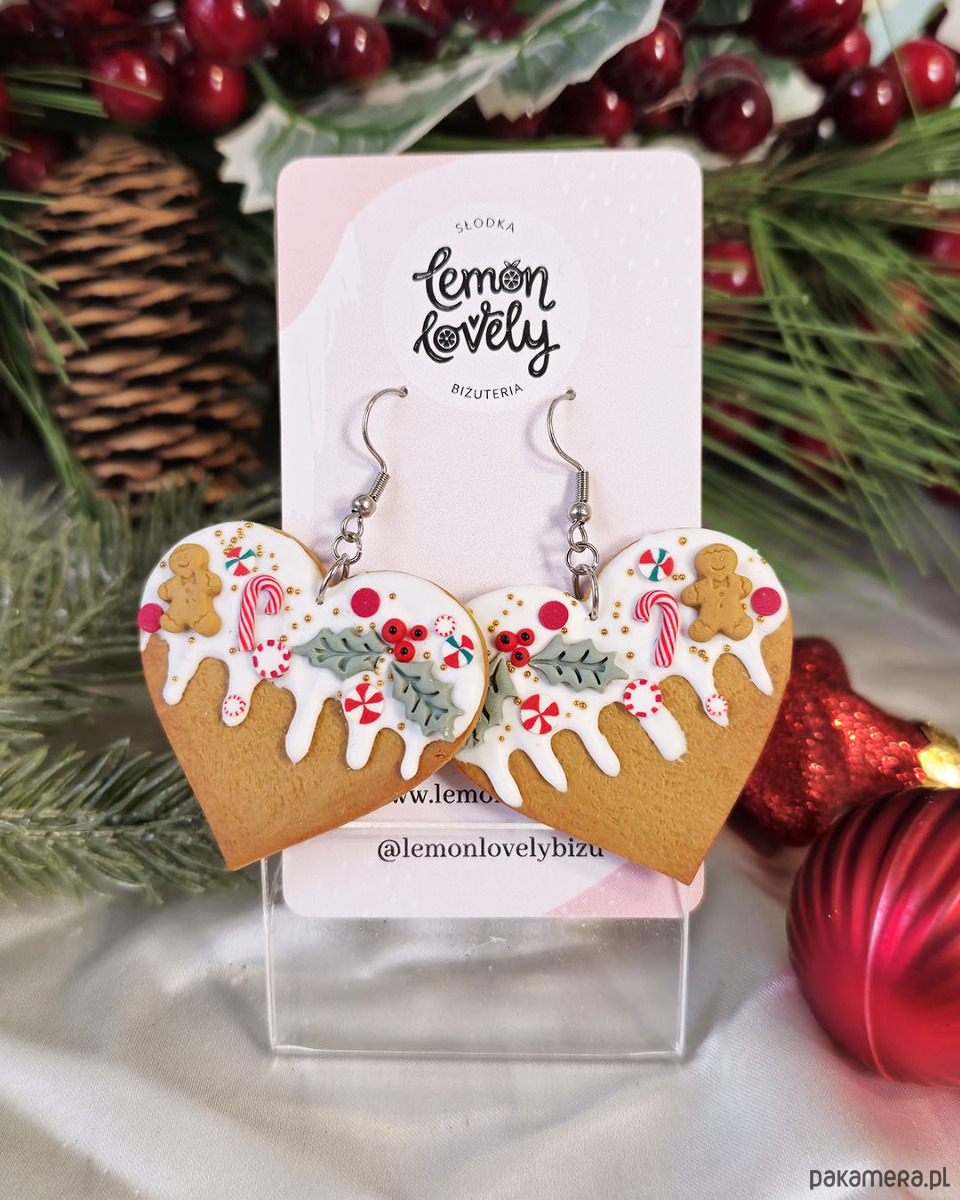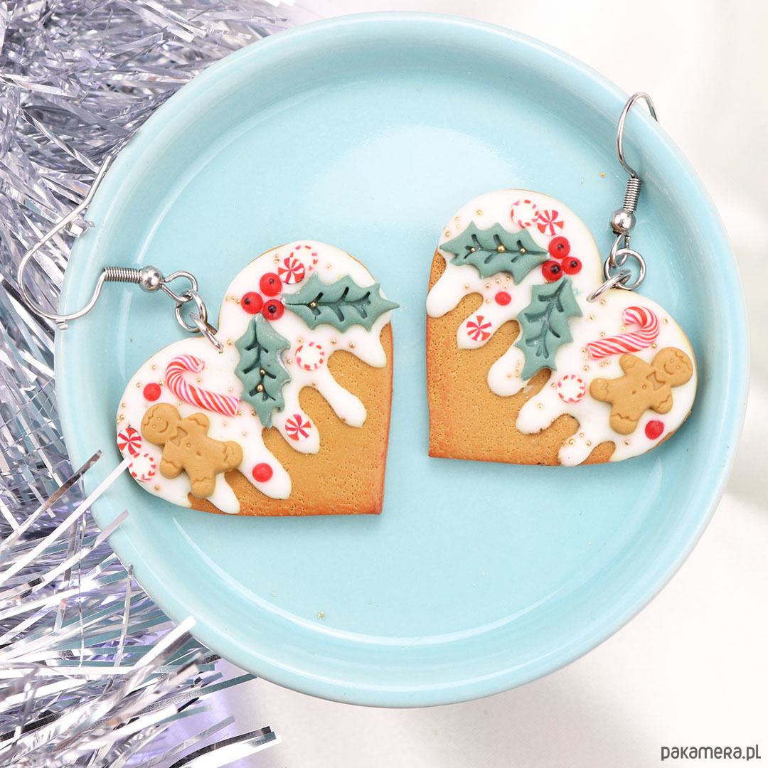 Te kolczyki wprowadzą Cię w świąteczny nastrój - serca pierniczki z ozdobami. Kolczyki zostały w całości ulepione ręcznie z glinki polimerowej. Kolczyki są duże, ale bardzo lekkie.