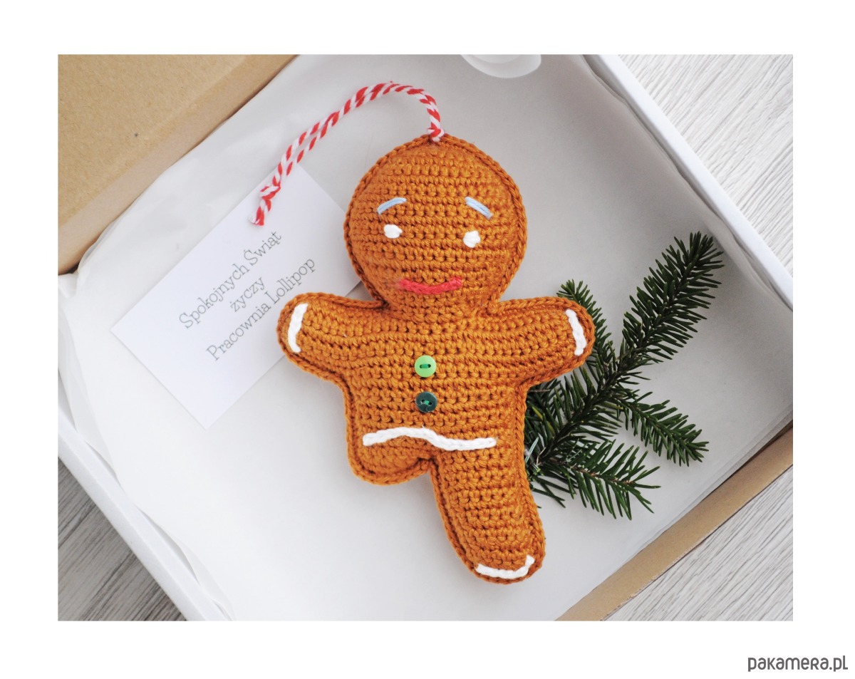 Ta wyjątkowa ozdoba przypomina małego, uśmiechniętego piernikowego ludzika, ale została wykonana na szydełku z miękkiej bawełny. Jej brzegi ozdobiono białą nitką, która wygląda jak lukrowe wzorki na prawdziwym pierniku. Na środku znajdują się dwa małe guziczki, dodające jej uroku. Ozdoba jest lekka i przyjemna w dotyku, a dzięki małemu sznureczkowi łatwo zawiesić ją na choince lub na bożonarodzeniowym wieńcu. Szydełkowy pierniczek nadaje drzewku ciepły, domowy i rękodzielniczy charakter — jakby dopiero co wyszedł z rodzinnej świątecznej pracowni.