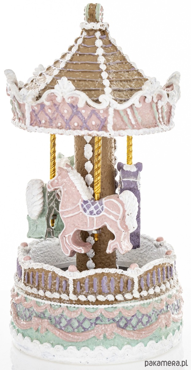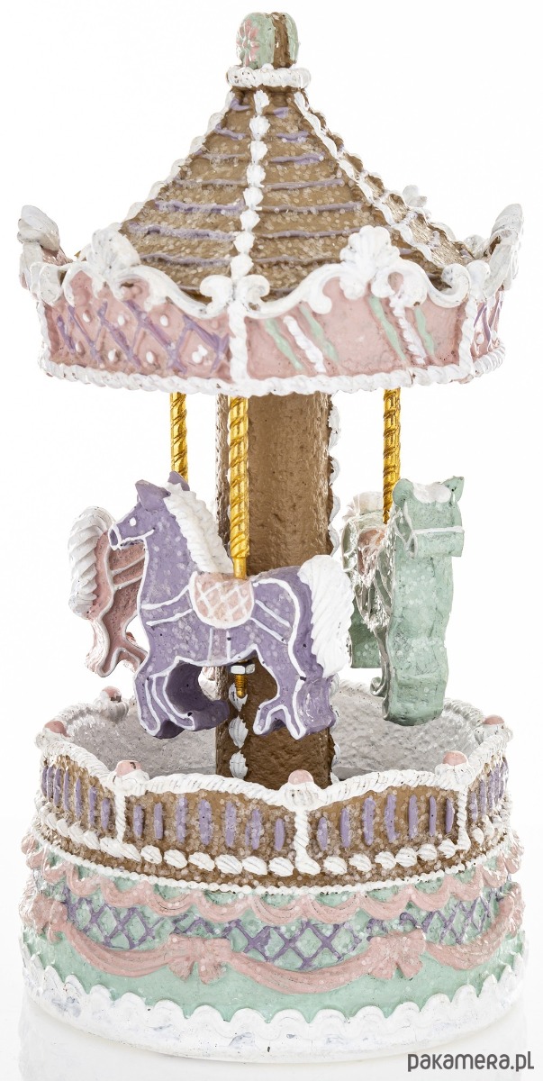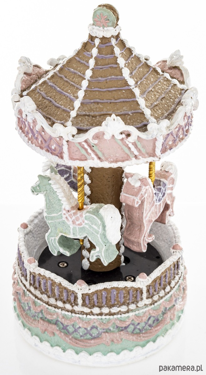 Karuzela wykonana z poliresingu. Ma kształt walca, ozdobiona konikami. Ustawiona w pokoju gdy gra melodyjkę JINGLE BELLS wprowadzi w nastrój zbliżających się świąt.