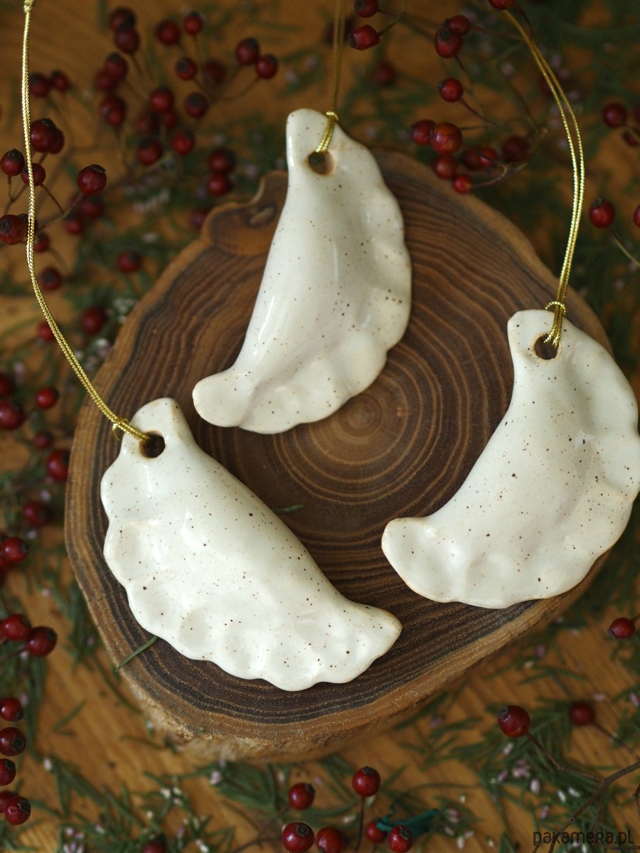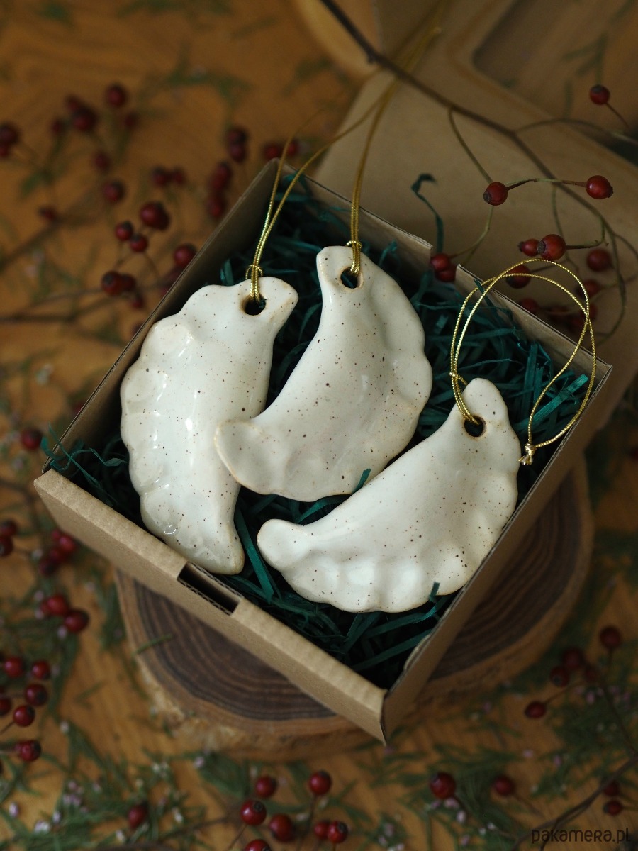 Zestaw trzech ceramicznych pierogów na choinkę w pudełku 10x10cm. Dwustronnie szkliwione kremowym, delikatnie nakrapianym szkliwem.