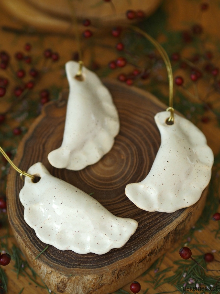 Zestaw trzech ceramicznych pierogów na choinkę w pudełku 10x10cm. Dwustronnie szkliwione kremowym, delikatnie nakrapianym szkliwem.