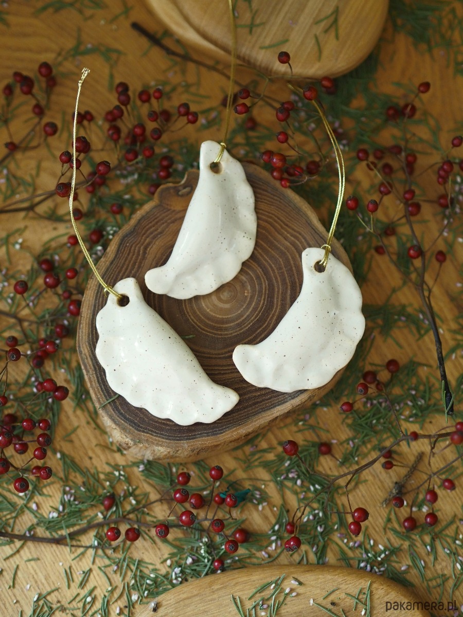Zestaw trzech ceramicznych pierogów na choinkę w pudełku 10x10cm. Dwustronnie szkliwione kremowym, delikatnie nakrapianym szkliwem.