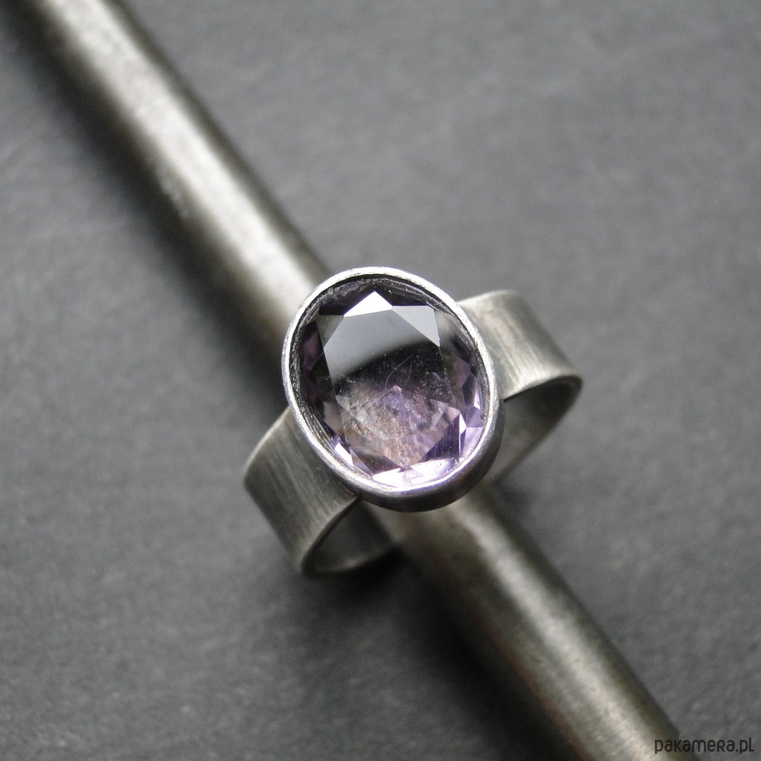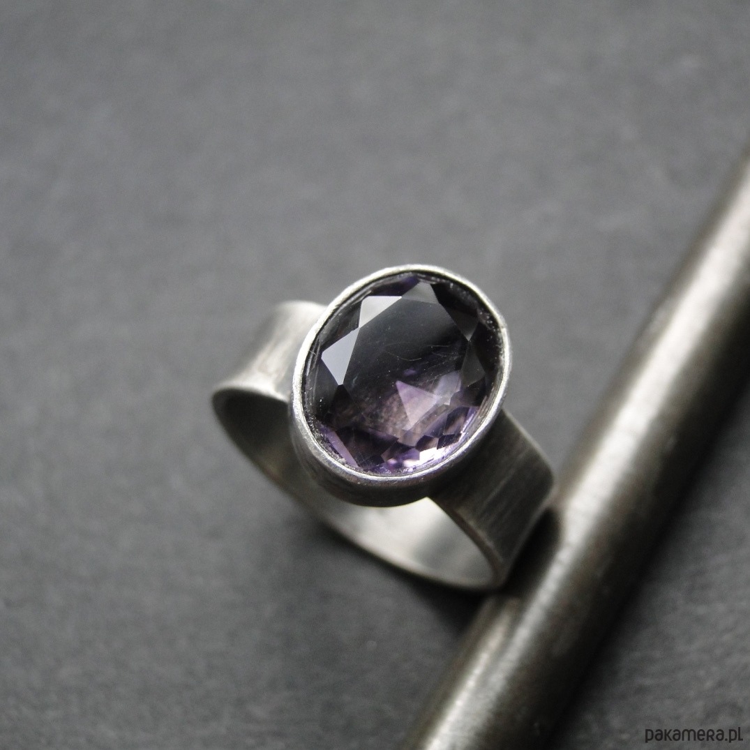 Surowy,klasyczny pierścień. Srebro 925,oksydowane i szorowane. Kamień: naturalny ametryn wysokiej klasy o wym.11x9mm,szlif brylantowy. Kamień wklejany,zakuwany. Rozmiar jubilerski 14,pasuje a palec 13,5-14. Nie moczyć w wodzie.