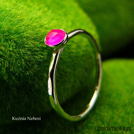 Delikatny pierścień wykonany ręcznie ze srebra próby 925. Sercem jest Fuksjowy fasetowany Agat 4 mm. Całość mocno wypolerowana, powierzchnia srebra fakturowana. Rozmiar obrączki 12 (16,6 milimetrów).Nie Twój rozmiar? nic nie szkodzi, mogę go powiększyć lub zmniejszyć dla Ciebie na zamówienie – napisz do mnie. Jeśli nie znasz swojego rozmiaru, pomogę Ci go dopasować :)