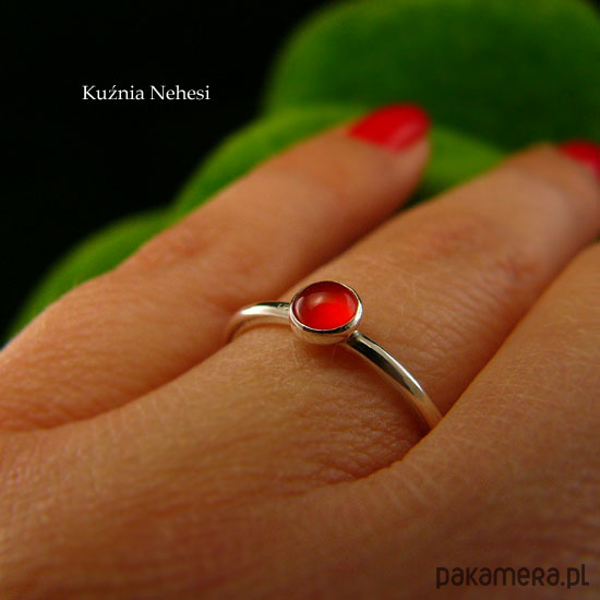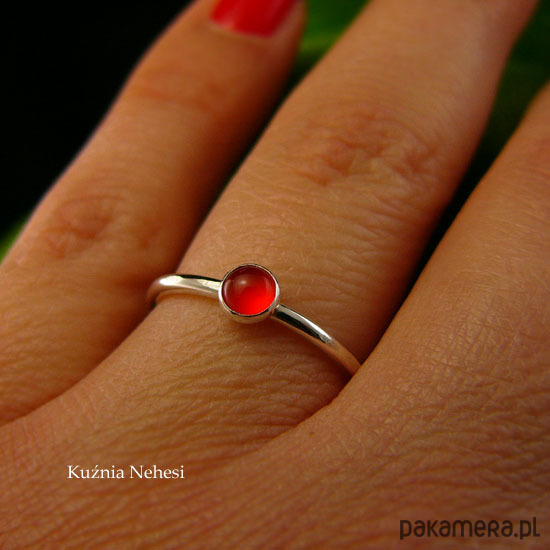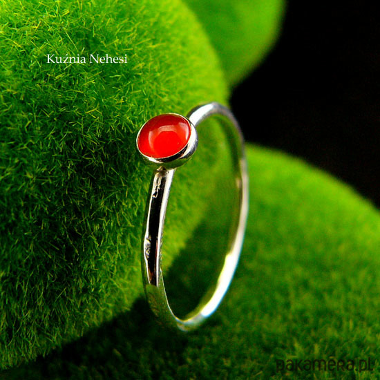 Delikatny pierścień wykonany ręcznie ze srebra próby 925. Sercem jest naturalny elektryzujący Karneol. Oprawa z kamieniem 4,2 mm. Całość mocno wypolerowana, powierzchnia srebra fakturowana. Rozmiar 12 - 16.6 milimetra. Karneol to kamień dobrego samopoczucia, pomaga w nauce, poprawia pamięć. Łagodzi gniew, strach i wybuchy wściekłości. Dla mnie kolor pomarańczowy zawsze dodaje mi energii. Polecam Nehesi Chcesz mieć taki pierścień w swoim rozmiarze lub z innym minerałem, napisz do mnie, a wykonam go dla Ciebie na zamówienie. Jeśli nie znasz swojego rozmiaru, pomogę Ci go dopasować :)
