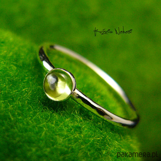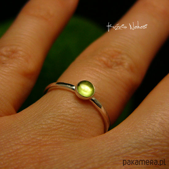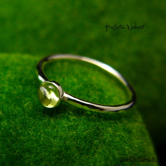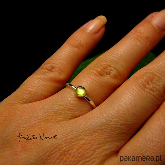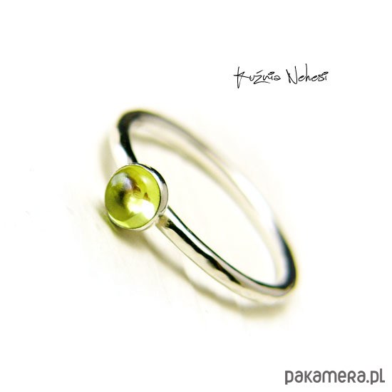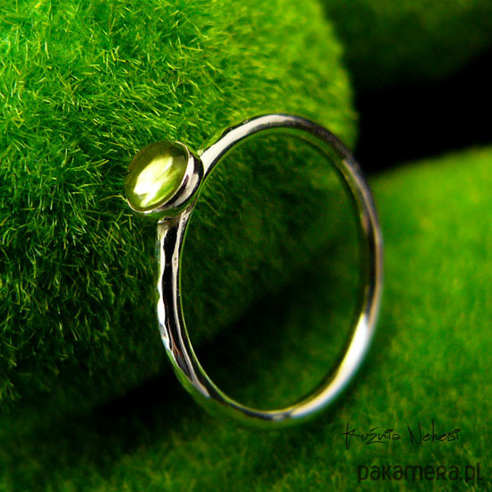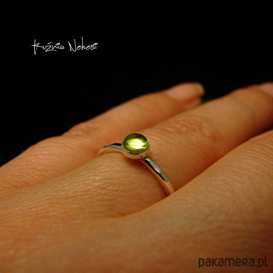 Delikatny pierścień wykonany ręcznie ze srebra próby 925. Sercem jest naturalny Oliwin. Całość mocno wypolerowana, powierzchnia srebra fakturowana. Rozmiar obrączki 9,5 (15,8 milimetrów). Nie Twój rozmiar, nic nie szkodzi, mogę powiększyć lub zmniejszyć go dla Ciebie na zamówienie - napisz do mnie :) Jeśli nie znasz swojego rozmiaru, pomogę Ci go dopasować :)