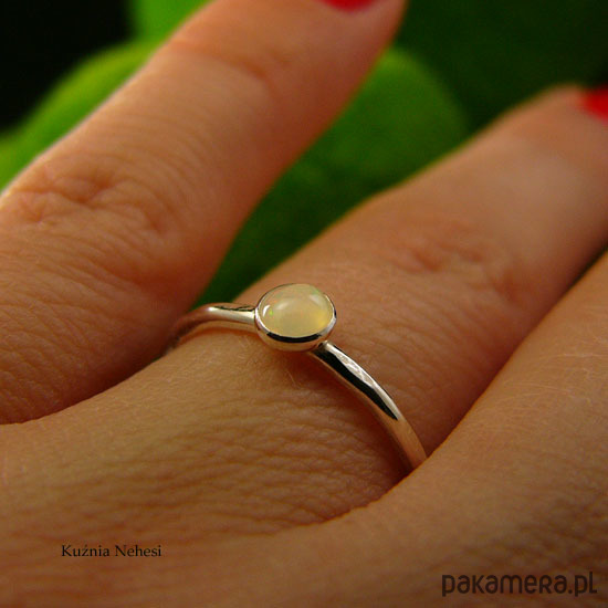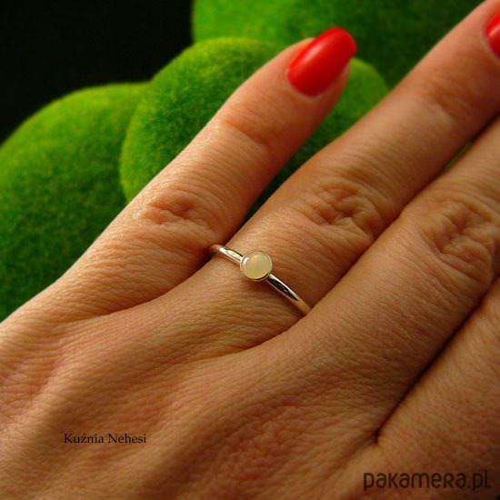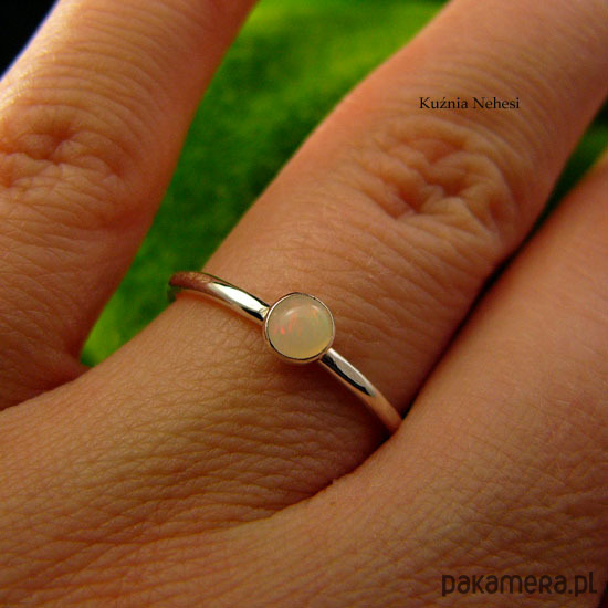 Delikatny pierścień wykonany ręcznie ze srebra próby 925. Sercem jest naturalny Opal Etiopski, mieni się barwą kolorów. Oprawa z kamieniem 4,2 mm. Całość mocno wypolerowana, powierzchnia srebra fakturowana. Rozmiar 12 - 16.6 milimetra. Chcesz mieć taki pierścień w swoim rozmiarze lub z innym minerałem, napisz do mnie, a wykonam go dla Ciebie na zamówienie. Jeśli nie znasz swojego rozmiaru, pomogę Ci go dopasować :)