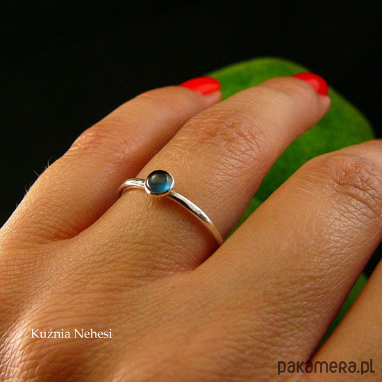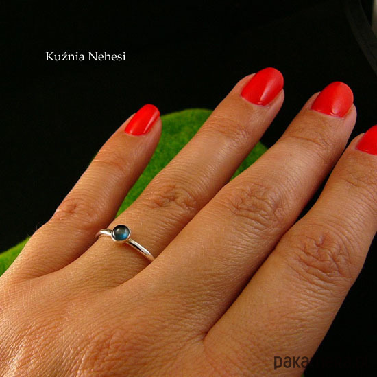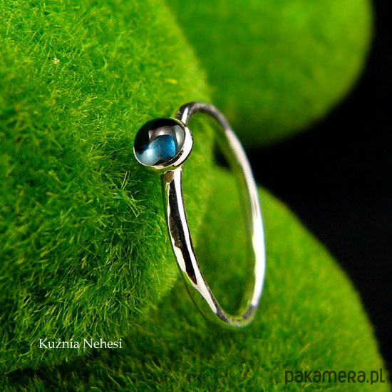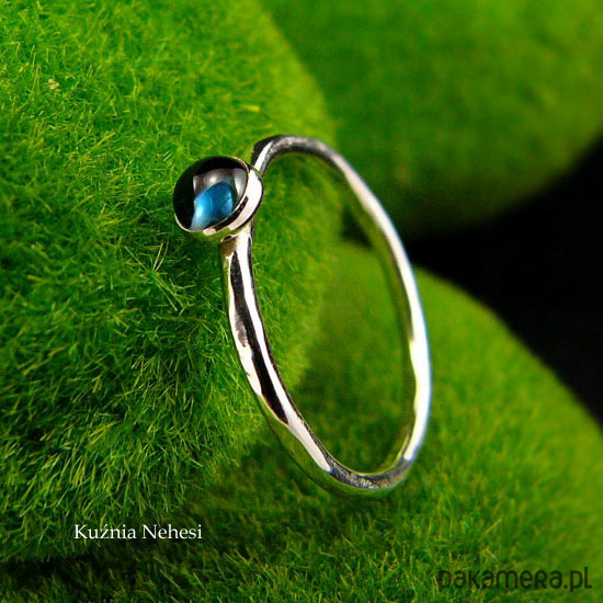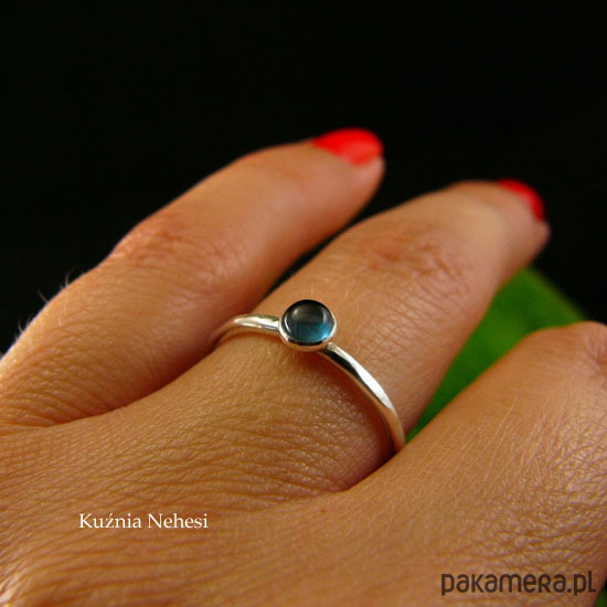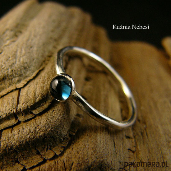 Delikatny pierścień wykonany ręcznie ze srebra próby 925. Sercem jest Topaz w kolorze London Blue 4 mm. Całość mocno wypolerowana, powierzchnia srebra fakturowana. Rozmiar obrączki 12 (16,6 milimetrów). Nie Twój rozmiar, nic nie szkodzi, mogę powiększyć lub zmniejszyć go dla Ciebie - napisz do mnie :) Jeśli nie znasz swojego rozmiaru, pomogę Ci go dopasować :)