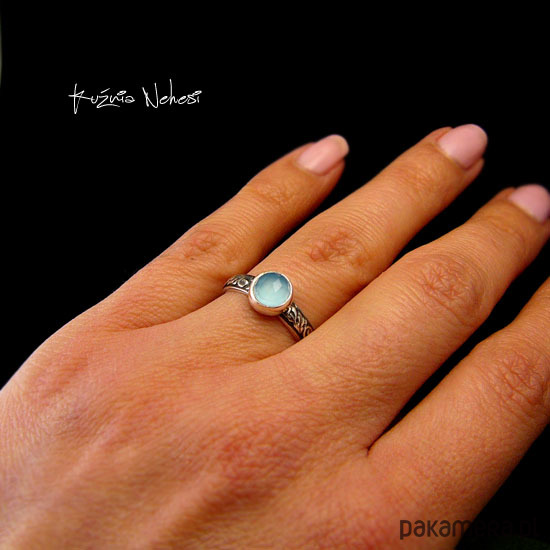 Ciekawy pierścień z kolekcji ,, Z Ogrodu Elfów ,, sercem jest niezwykłej urody fasetowana rozeta agatu o błękitnej barwie. Ubrałam go w srebro na przepięknej rzeźbionej obrączce w florystyczne wzory. Zdjęcie nie oddaje uroku kamienia w pełni. Pierścień wykonany ze srebra prób 925 oksydowany, wypolerowany na wysoki połysk. Rozmiar obrączki 12 ( 16,6 mm). Mogę wykonać taki sam dla Ciebie na zamówienie - napisz do mnie, czas realizacji zamówienia 2 dni :)