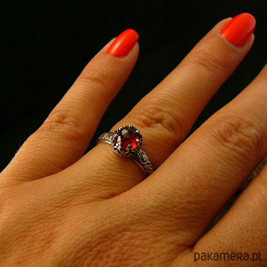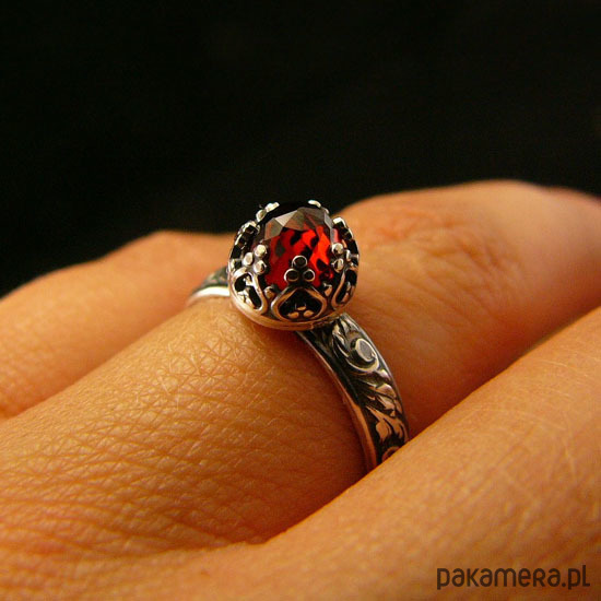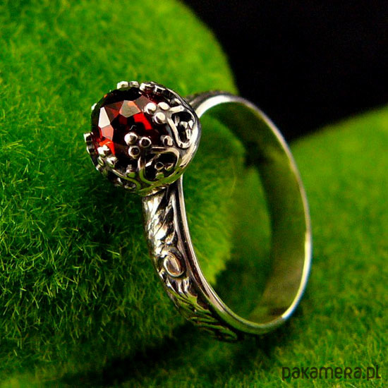 Piękny pierścień z kolekcji ,, Z Ogrodu Elfów ,, Rozeta 10 karatowego Granatu Almandyn klasy AAA zakuta w koronkach na przepięknej rzeźbionej obrączce w florystyczne wzory. Pierścień wykonałam ręcznie ze srebra próby 925 oksydowany, wypolerowany na wysoki połysk. Rozmiar obrączki 12 ( 16,6 milimetra). Nie Twój rozmiar? nic nie szkodzi, mogę go powiększyć lub zmniejszyć dla Ciebie – napisz do mnie.