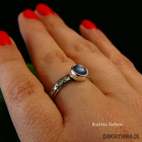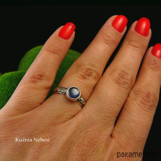 Przepiękny pierścień z kolekcji ,, Z Ogrodu Elfów ,, sercem jest cudnej urody naturalny Kyanit, zakuty został w srebro na rzeźbionej obrączce w florystyczne wzory. Zdjęcie nie oddaje w pełni barwy kamienia. Wymiar kamienia z oprawą - 7 mm. Pierścień wykonany ze srebra 925, ręcznie oksydowany, cechowany wypolerowany na wysoki połysk. Rozmiar obrączki 12 ( 16,6 milimetra). Nie Twój rozmiar? nic nie szkodzi, mogę go powiększyć lub zmniejszyć dla Ciebie – napisz do mnie.
