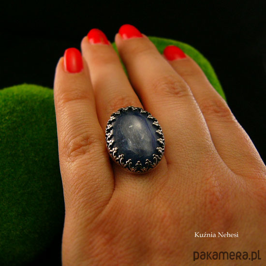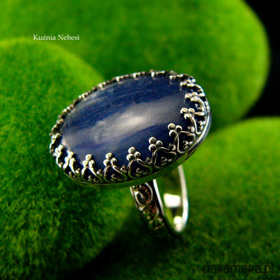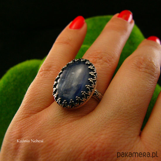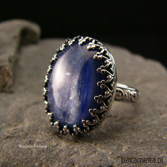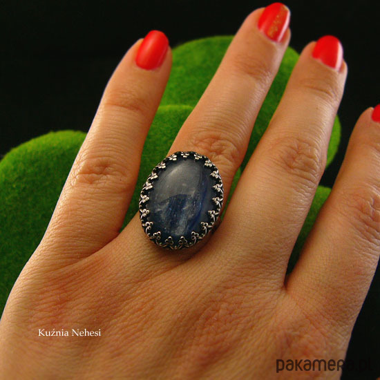 Koronkowy pierścień którego sercem jest cudnej urody naturalny atramentowy Kyanit, zakuty został na młotkowanej obrączce. Zdjęcie nie oddaje w pełni barwy kamienia, jest w 100% naturalny, posiada delikatne naturalne inkluzje. Pierścień wykonany ze srebra 925, ręcznie oksydowany, cechowany wypolerowany na wysoki połysk. Średnica kasety z kamieniem 17x22 mm. Rozmiar obrączki 13 ( 16.9 milimetra). Nie Twój rozmiar? nic nie szkodzi, mogę go powiększyć lub zmniejszyć dla Ciebie na zamówienie – napisz do mnie.