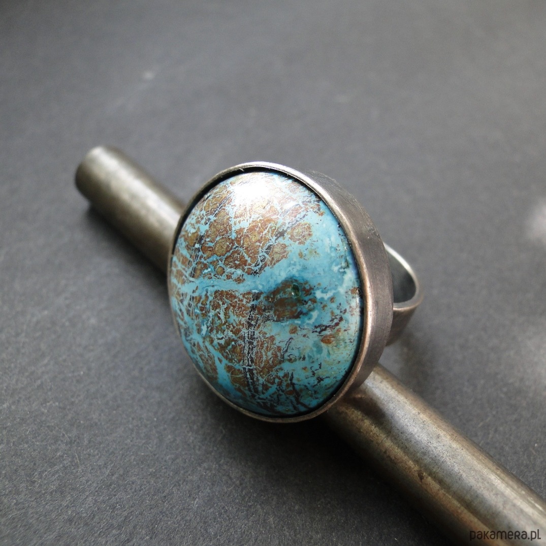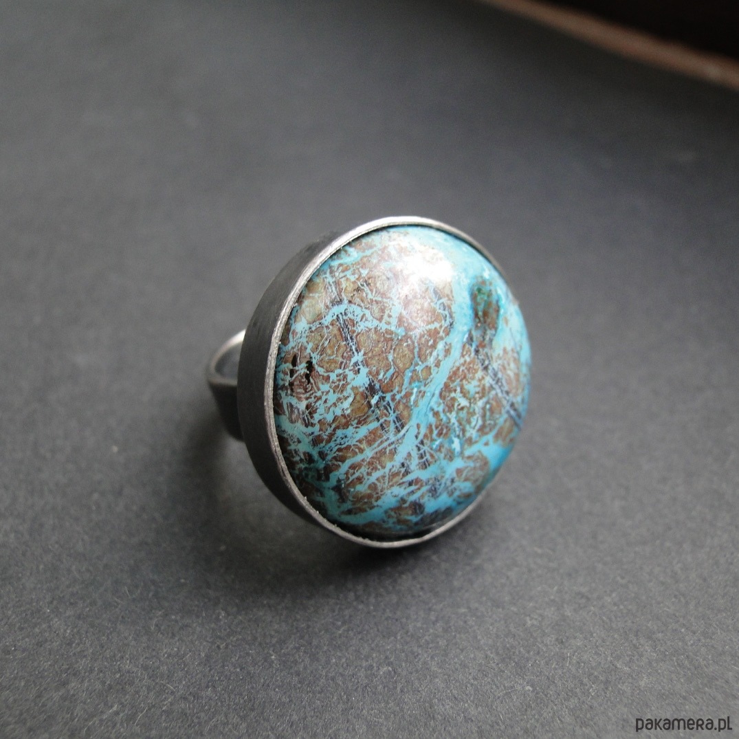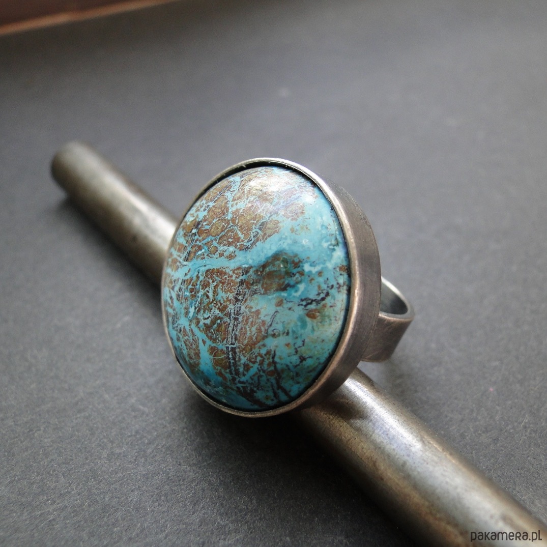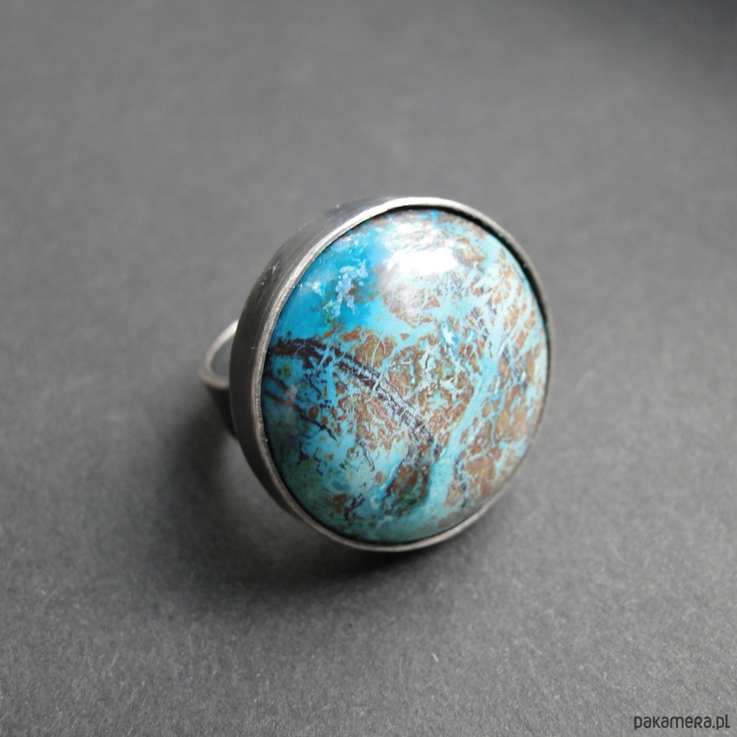 Surowy,masywny pierścień. Srebro pr.925,oksydowane i szorowane. Kamień: piękna chryzokola śr.2,5 cm. Oprawiona w prostą kasetkę. Pierścień ma rozm.16. Zdejmować do mycia rąk.
