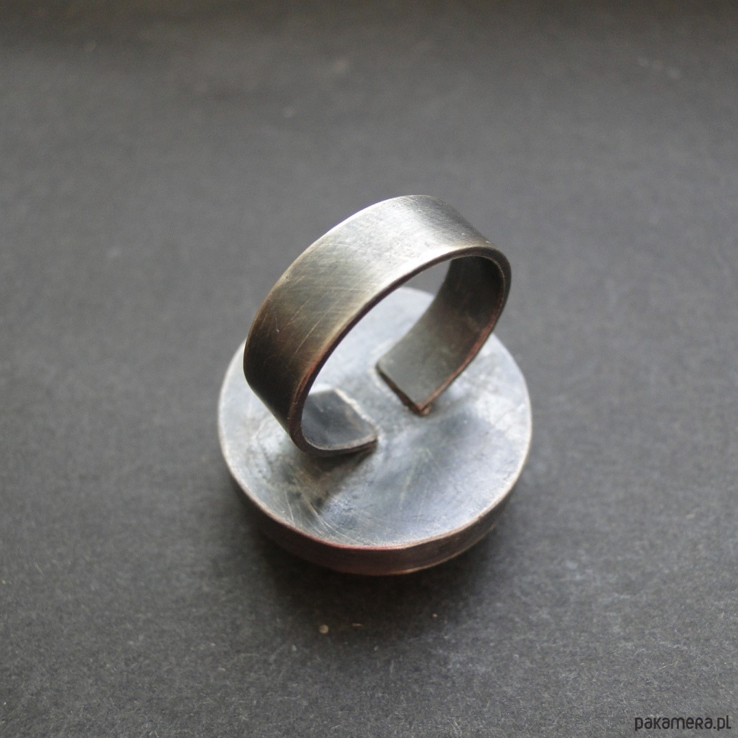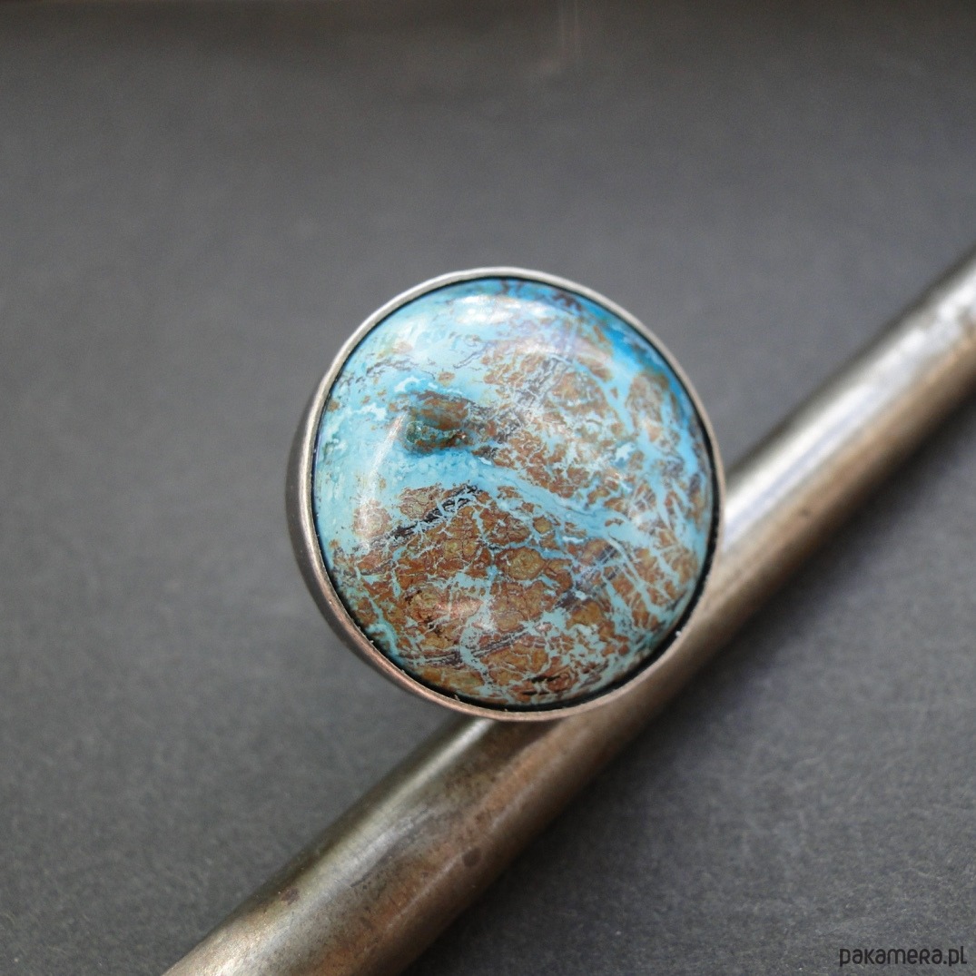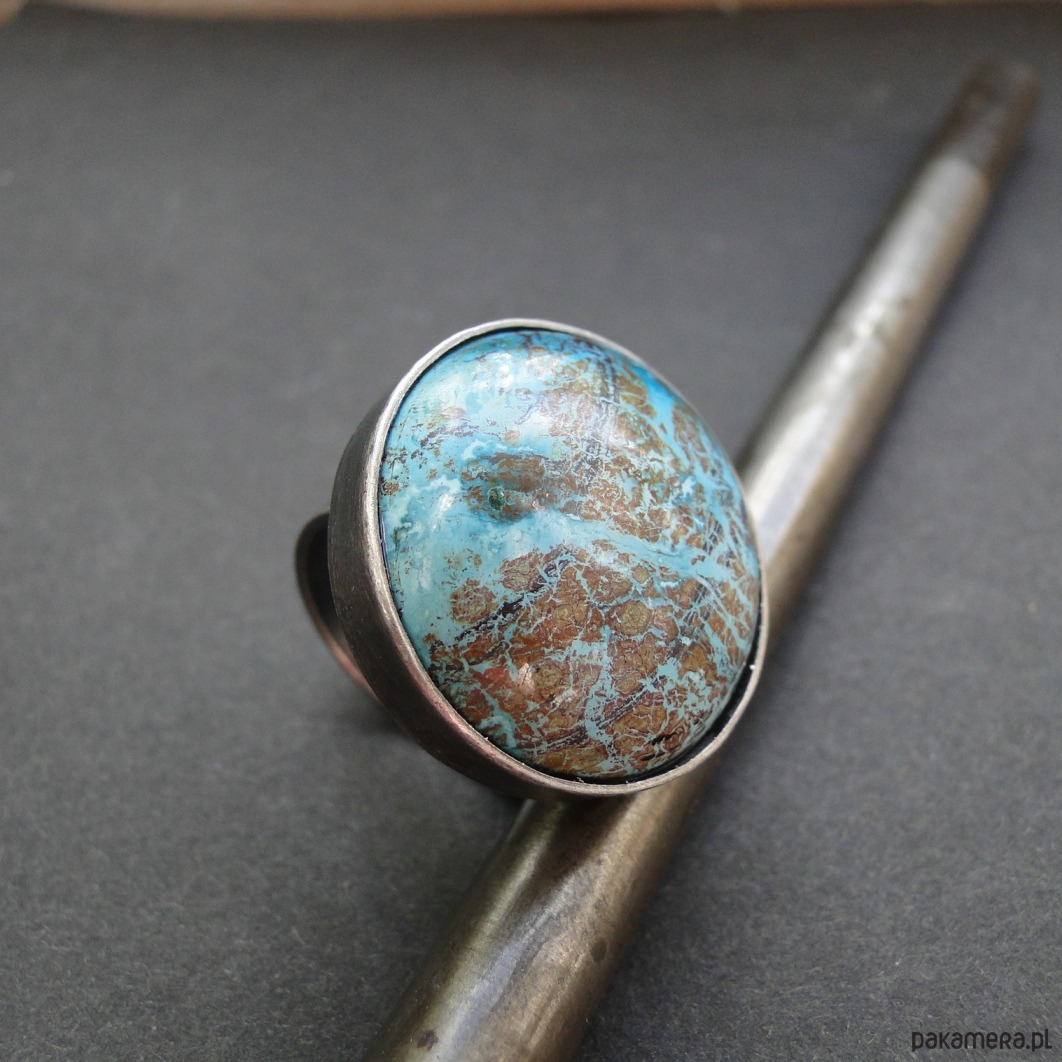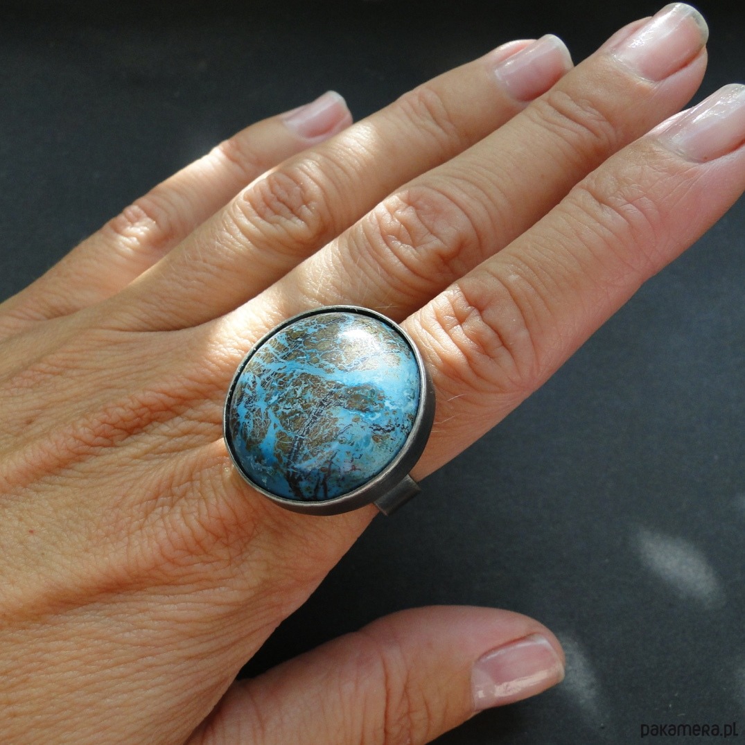 Surowy,masywny pierścień. Srebro pr.925,oksydowane i szorowane. Kamień: piękna chryzokola śr.2,5 cm. Oprawiona w prostą kasetkę. Pierścień ma rozm.16. Zdejmować do mycia rąk.