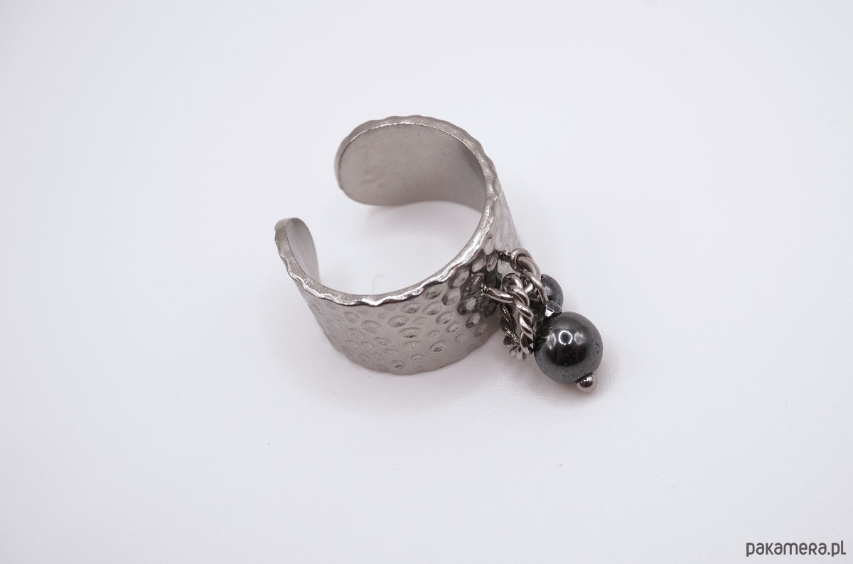 Akcentem są wiszące elementy z naturalnego hematytu — gładkie, ciemnoszare kuleczki o lustrzanym, metalicznym połysku. Ruchome detale tworzą subtelny dźwięk i dynamikę podczas ruchu, dodając pierścionkowi lekkości oraz oryginalności.