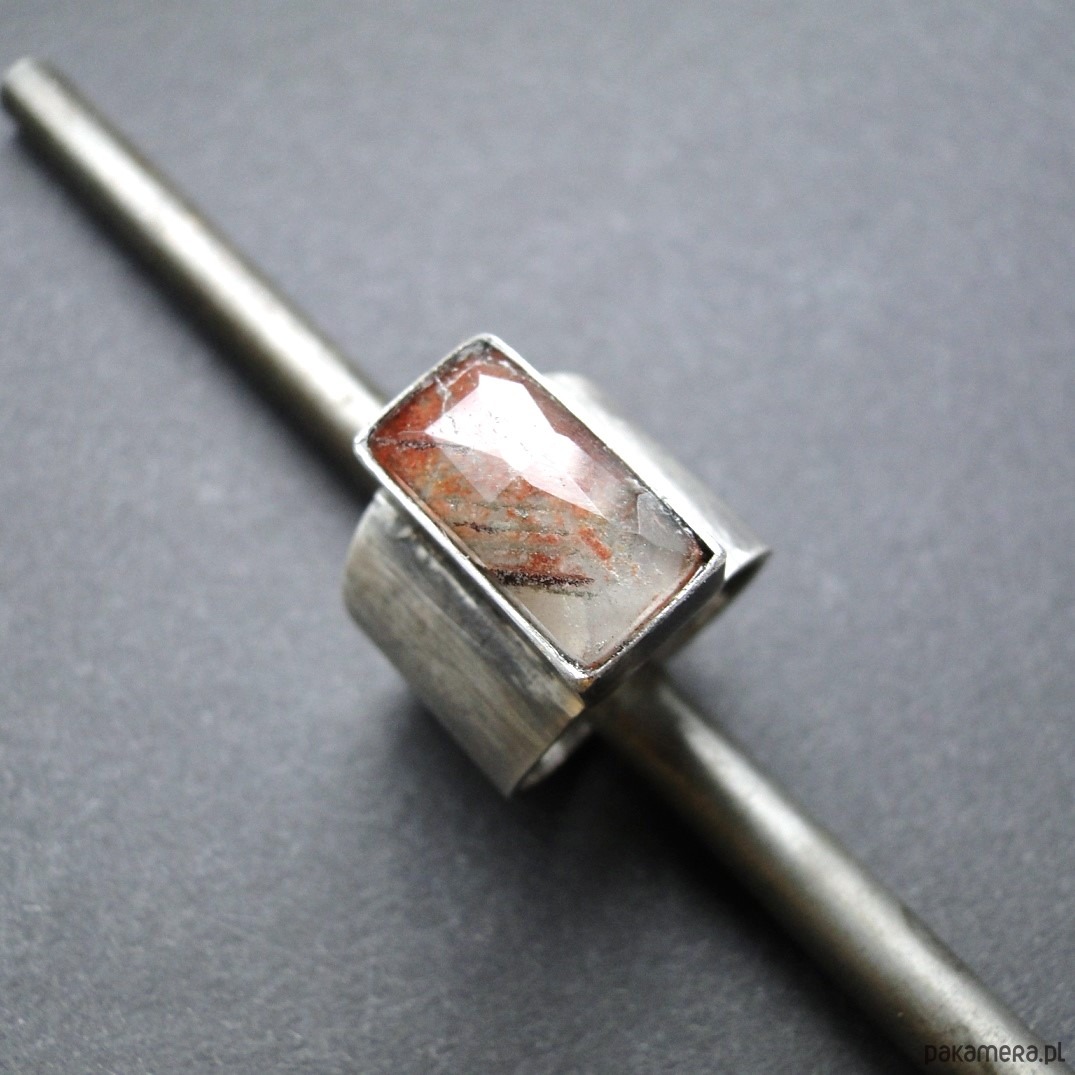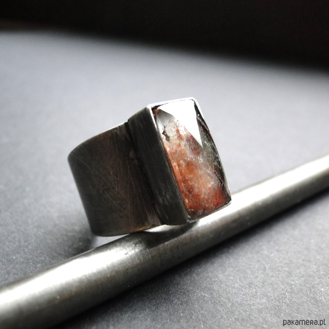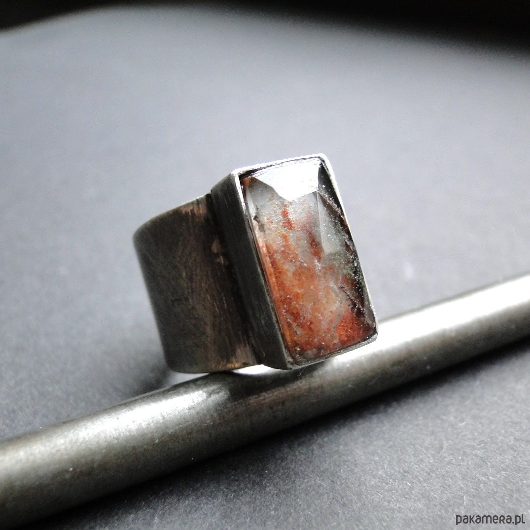 Masywny pierścień w pojedynczym egzemplarzu. Srebro 930,oksydowane i szorowane. Ciekawy minerał-Herkimer,nazywany też diamentem herkimer lub lodolitem. Kamień jest lekko surowy,dł. 16mm. Pierścień pasuje na palec r.16,5-17. Nie moczyć w wodzie. Obrączka rozcięta z tyłu co daje możliwość lekkiej regulacji.