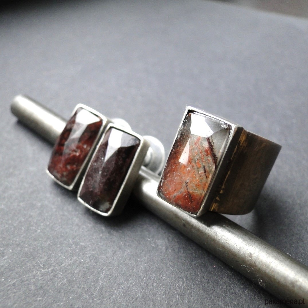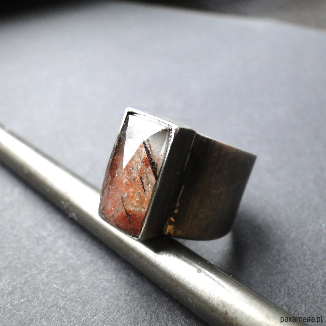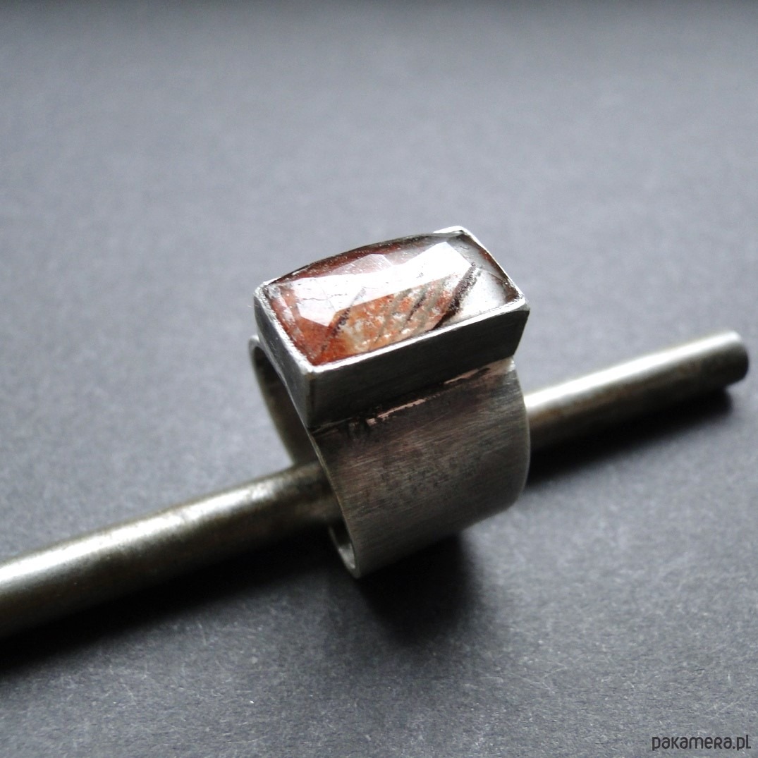 Masywny pierścień w pojedynczym egzemplarzu. Srebro 930,oksydowane i szorowane. Ciekawy minerał-Herkimer,nazywany też diamentem herkimer lub lodolitem. Kamień jest lekko surowy,dł. 16mm. Pierścień pasuje na palec r.16,5-17. Nie moczyć w wodzie. Obrączka rozcięta z tyłu co daje możliwość lekkiej regulacji.