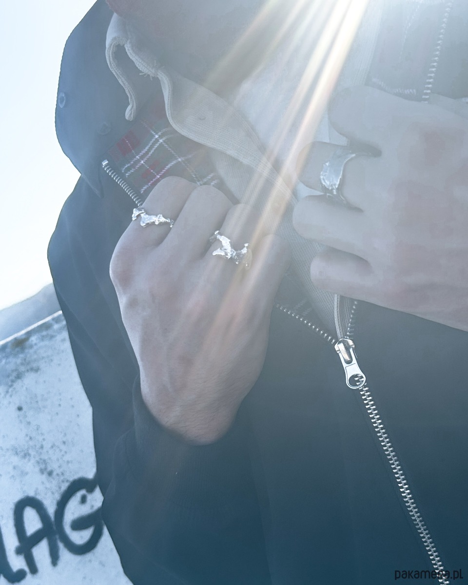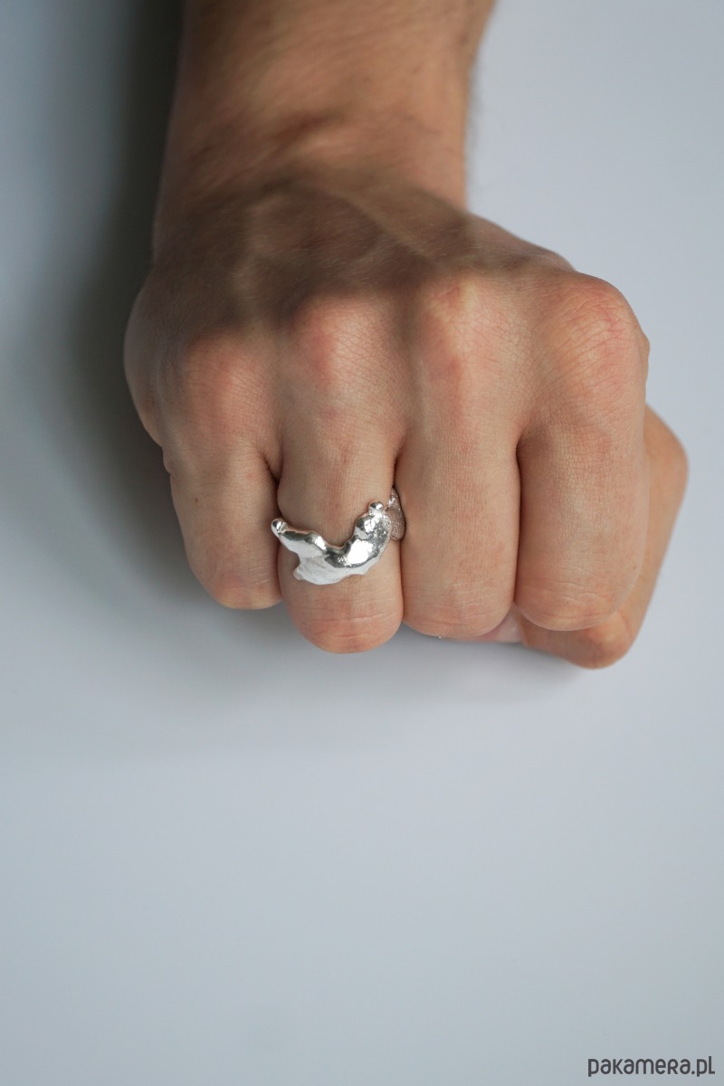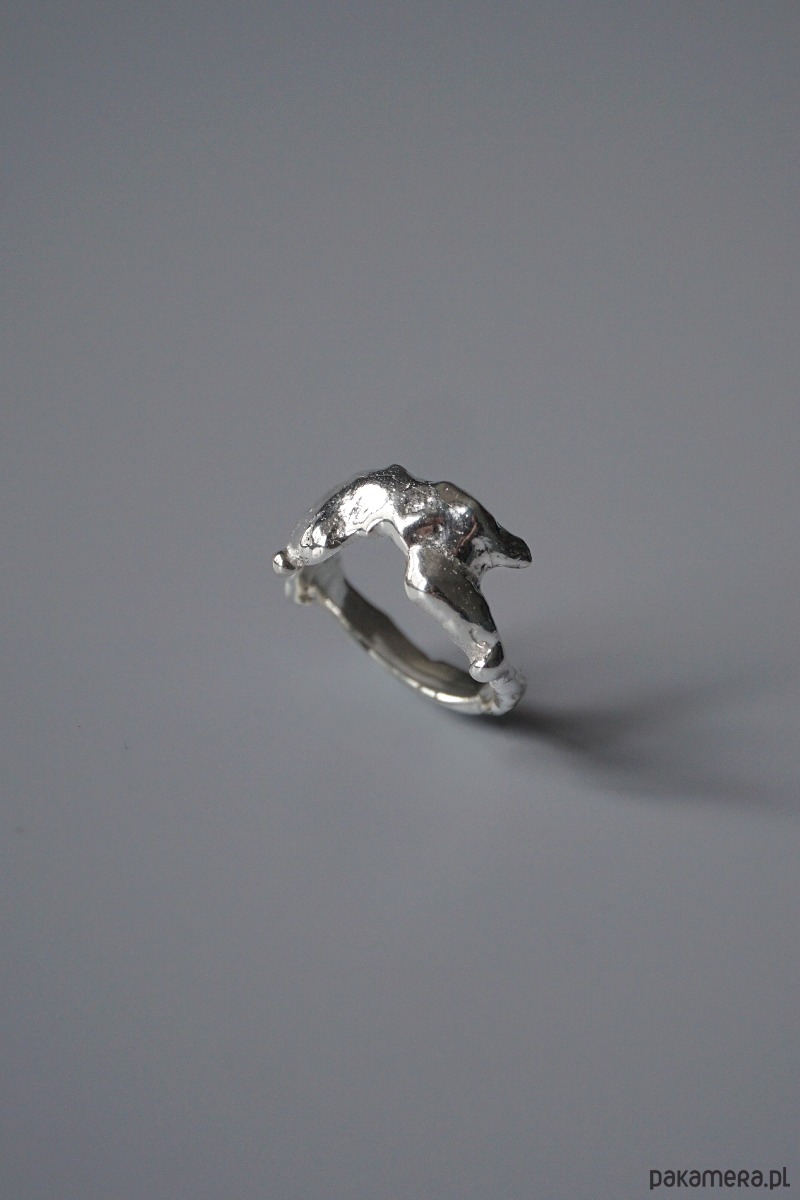 Srebrny pierścień o lejącej i wyrazistej fakturze. Wyrzeźbiony ręcznie w wosku, następnie odlany w srebrze próby 925 i ręcznie wykończony.