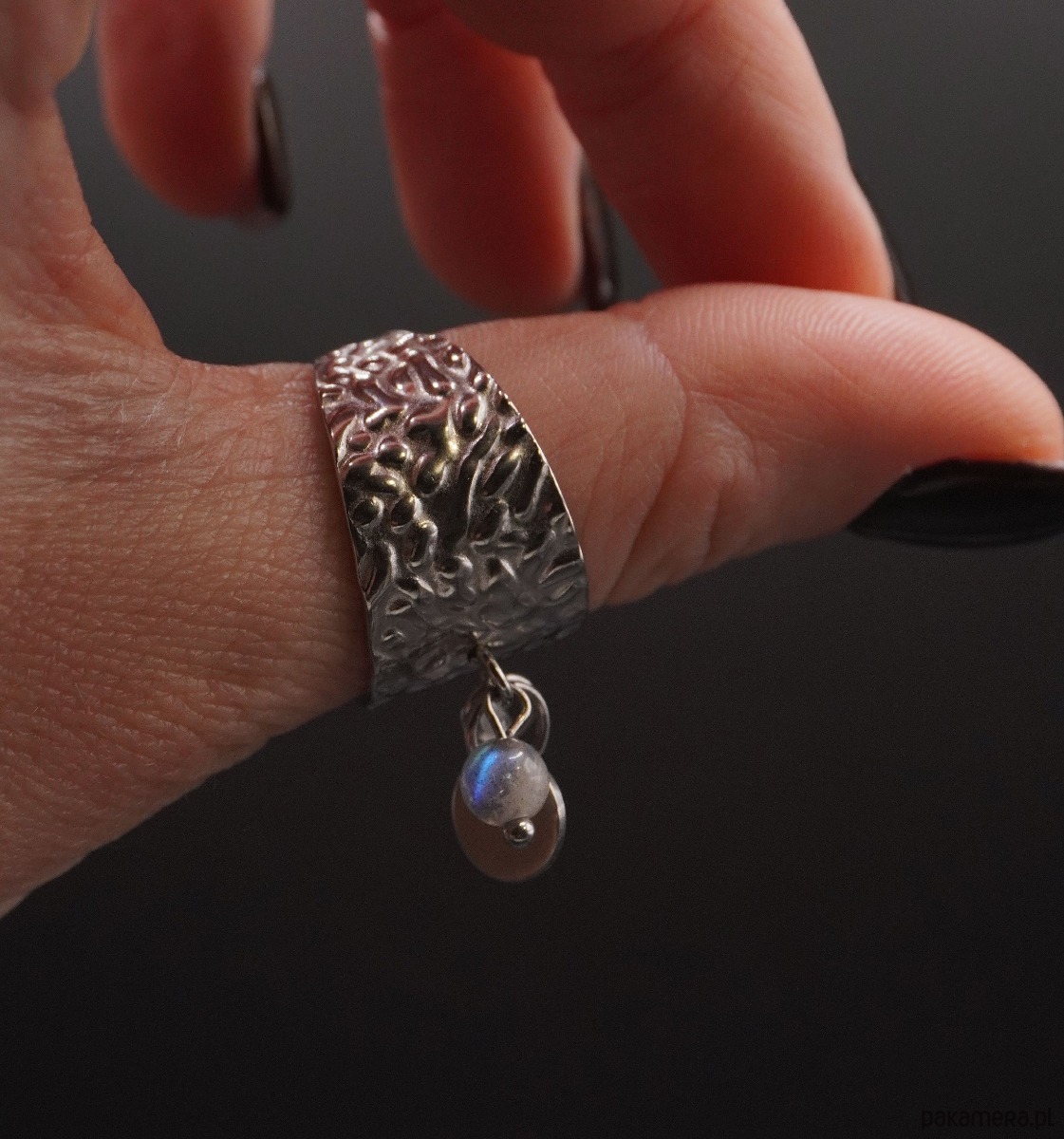 Ten pierścionek opowiada o równowadze siły i światła.Fakturalna powierzchnia ze stali nierdzewnej przywodzi na myśl naturalną, „żywą” formę, a ruchome zawieszki dodają biżuterii głębi i gry przy każdym ruchu dłoni.