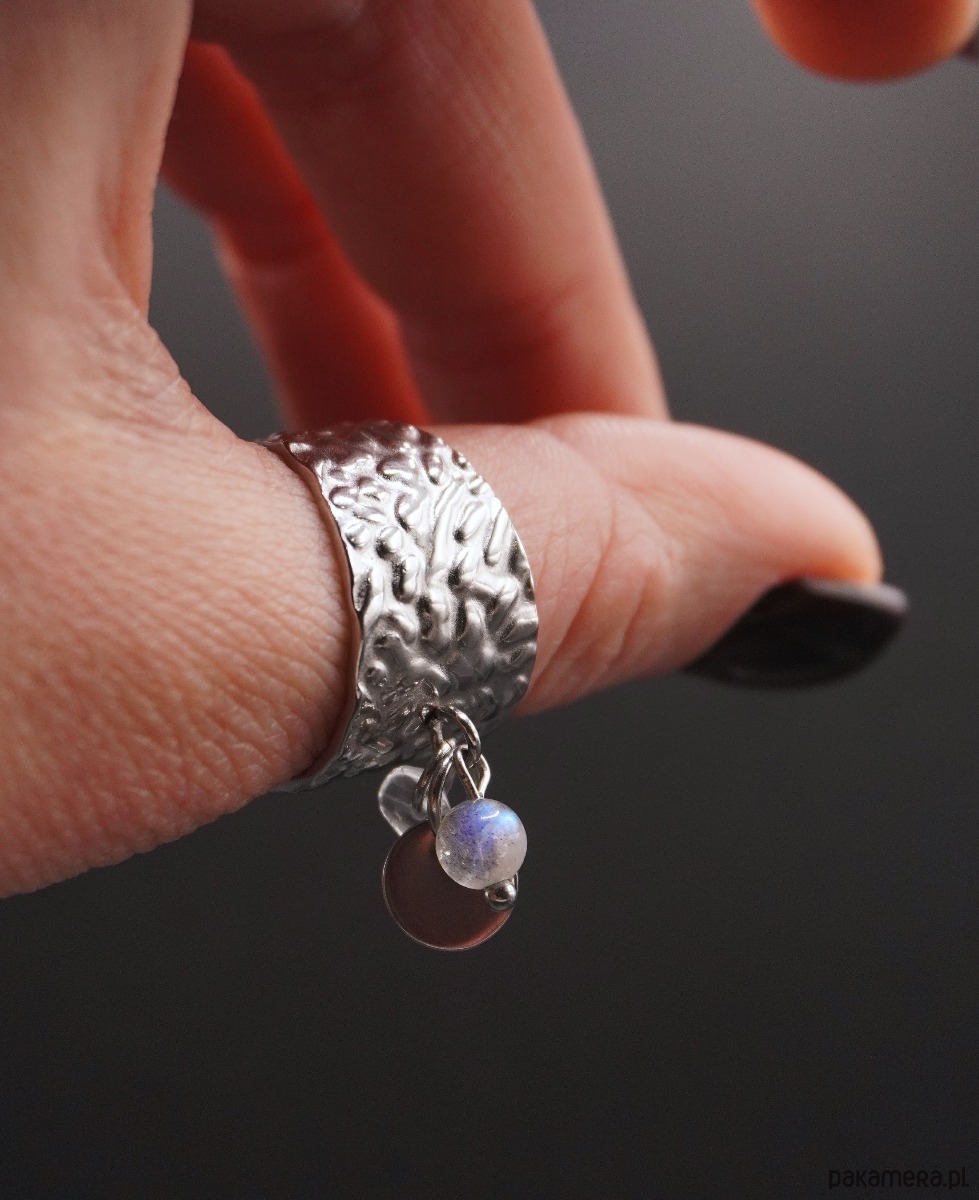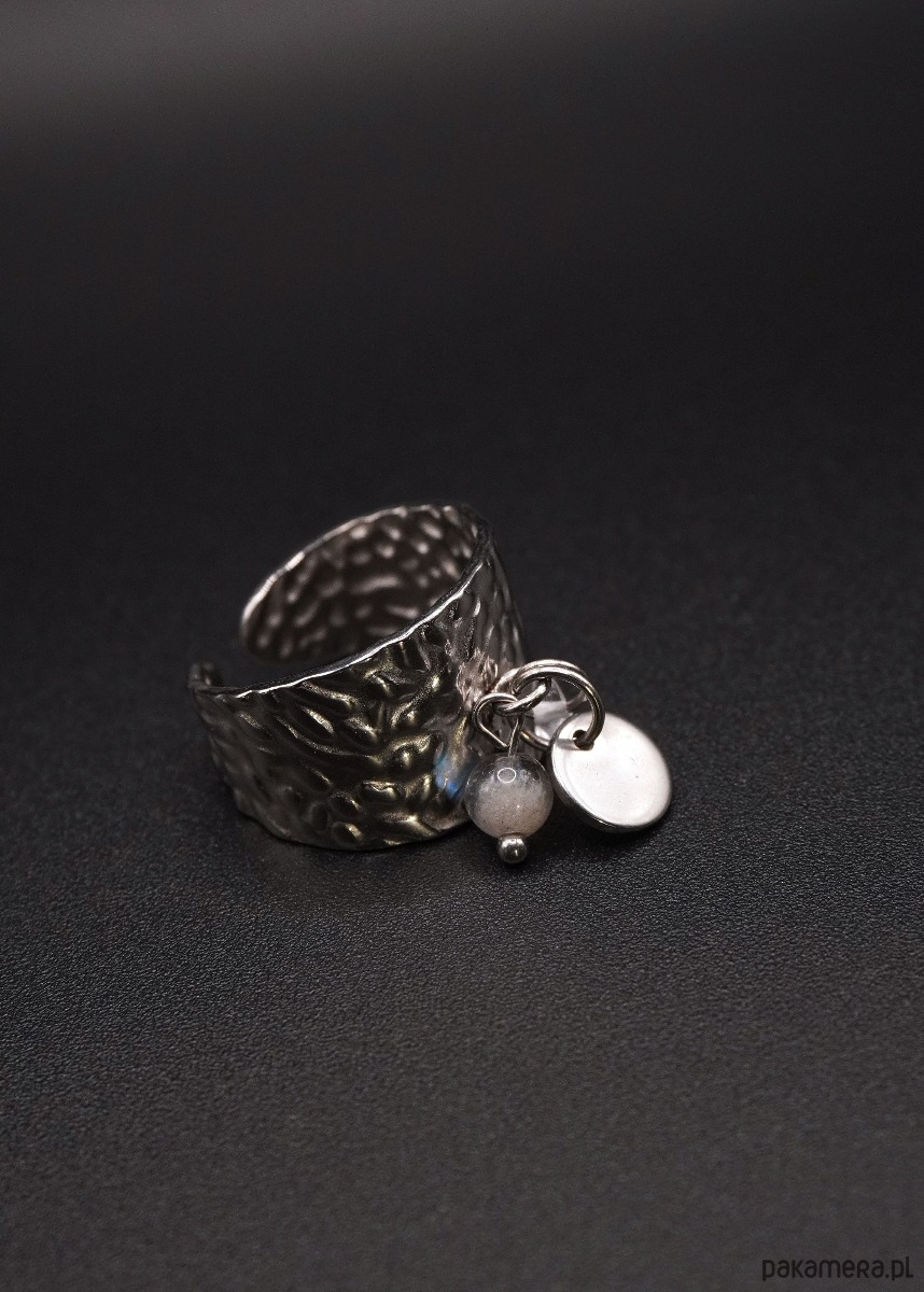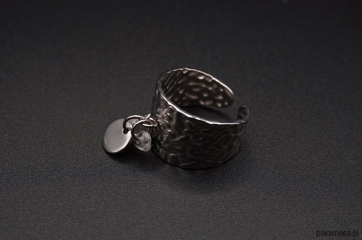 Ten pierścionek opowiada o równowadze siły i światła.Fakturalna powierzchnia ze stali nierdzewnej przywodzi na myśl naturalną, „żywą” formę, a ruchome zawieszki dodają biżuterii głębi i gry przy każdym ruchu dłoni.