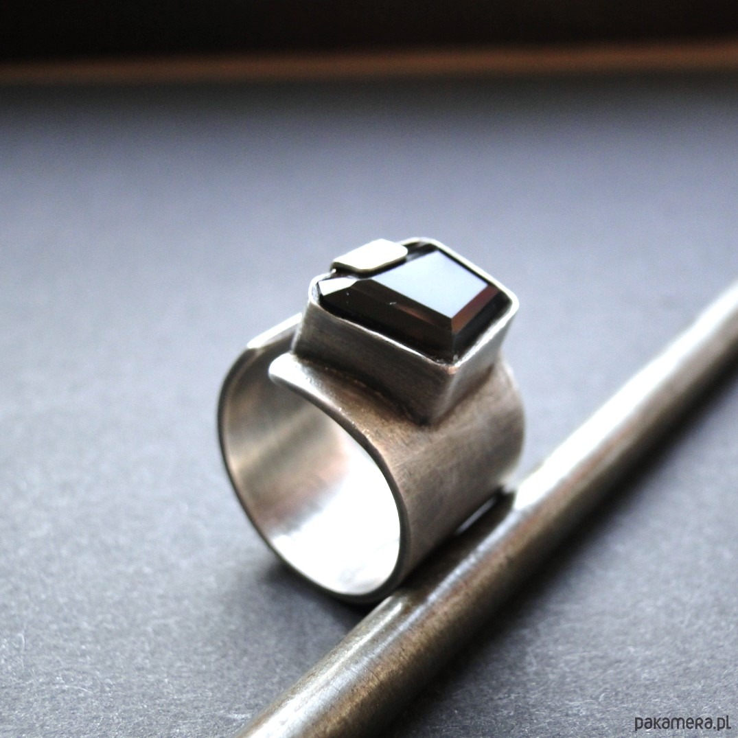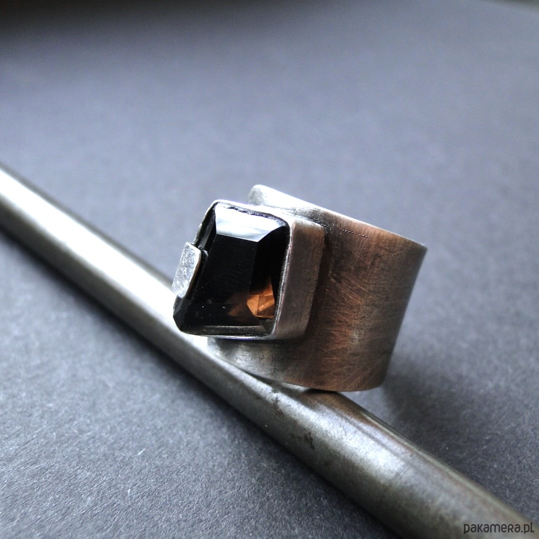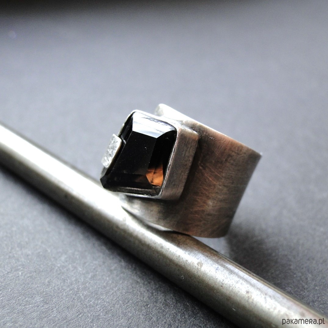 Surowy, totalnie niesymetryczny pierścień w kolorze głębokiego brązu. Wykonany ręcznie od podstaw ze srebra pr.925.Oksydowane i szorowany. Surowe wykończenie. Kamień: okazały, naturalny kwarc dymny dł. 14,5mm,w kolorze ciemnego brązu. Pierścień regulowany w r.15. Przy tej szerokości obrączki pasuje na 14-14,5. Nie moczyć w wodzie. Pierścień w unikatowym egzemplarzu.