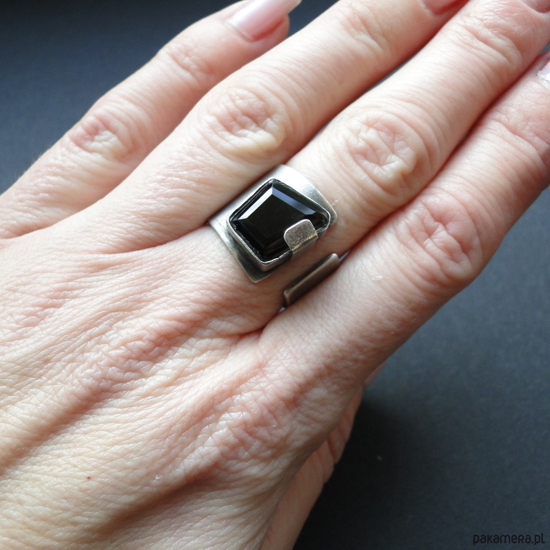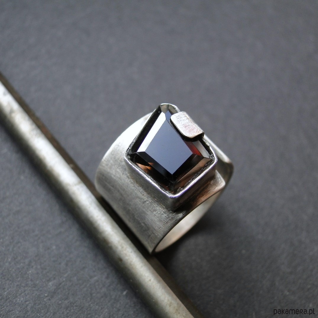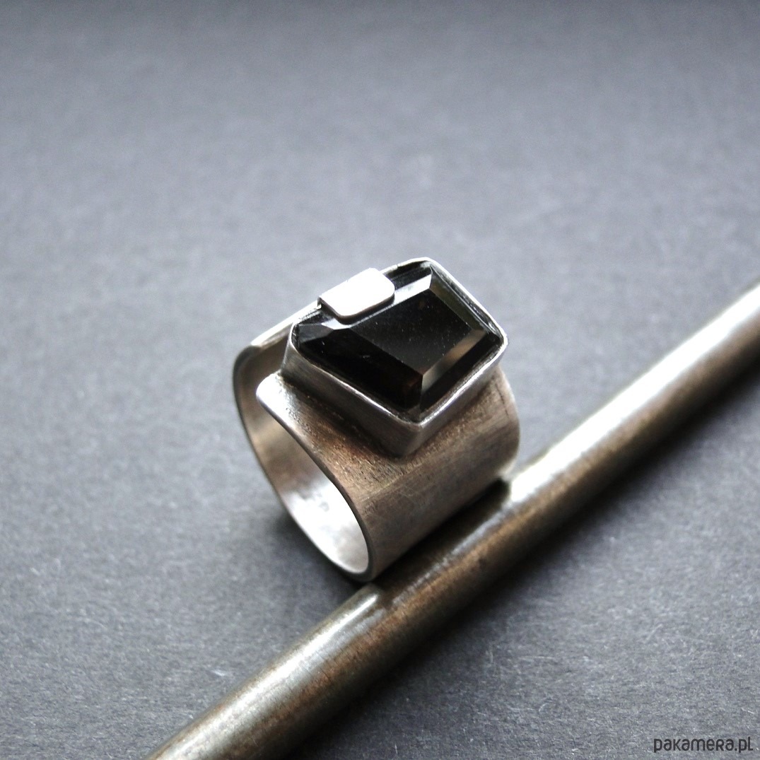Surowy, totalnie niesymetryczny pierścień w kolorze głębokiego brązu. Wykonany ręcznie od podstaw ze srebra pr.925.Oksydowane i szorowany. Surowe wykończenie. Kamień: okazały, naturalny kwarc dymny dł. 14,5mm,w kolorze ciemnego brązu. Pierścień regulowany w r.15. Przy tej szerokości obrączki pasuje na 14-14,5. Nie moczyć w wodzie. Pierścień w unikatowym egzemplarzu.
