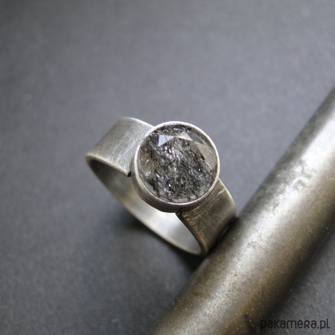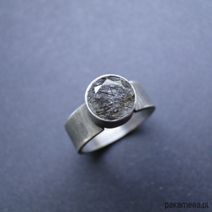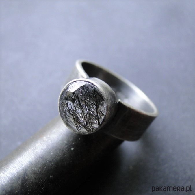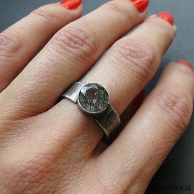 Surowy,elegancki pierścień wykonany ręcznie ze srebra pr.925.Oksydowany i szorowany. Kamień: piękny kwarc z czarnym turmalinem śr.8 mm.,szlif brylantowy. Rozmiar pierścionka 15. Będzie pasował na palec rozm. 14-14,5. Szerokość obrączki 6,5 mm. Waga całego pierścionka- 2,56g. Masa Ag ponizej 5g. Polecam naszyjnik do zestawu. Unikać moczenia w wodzie.