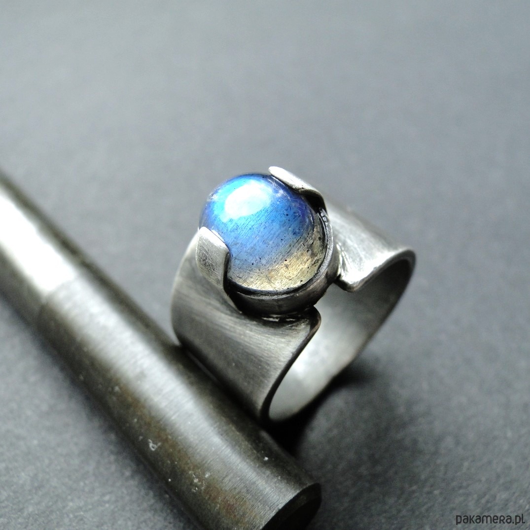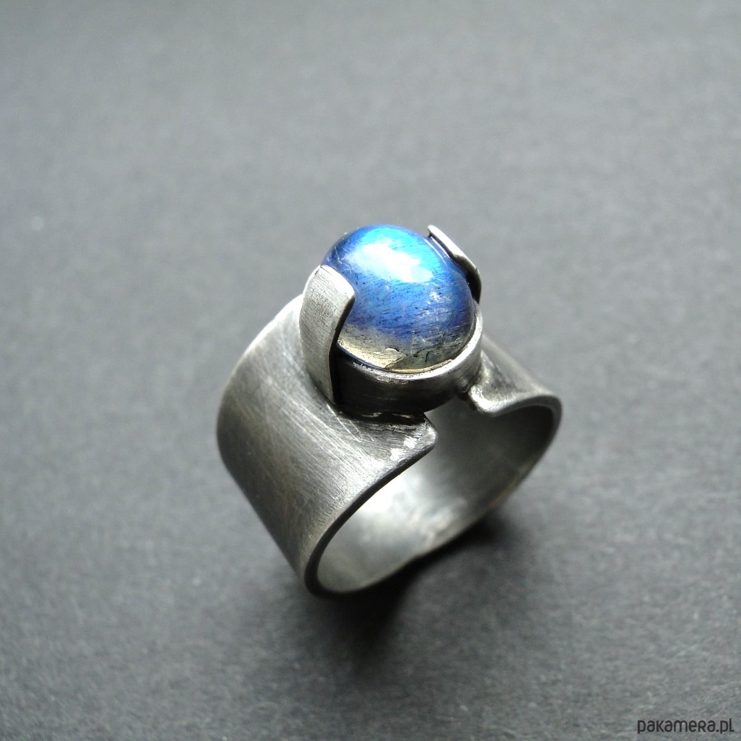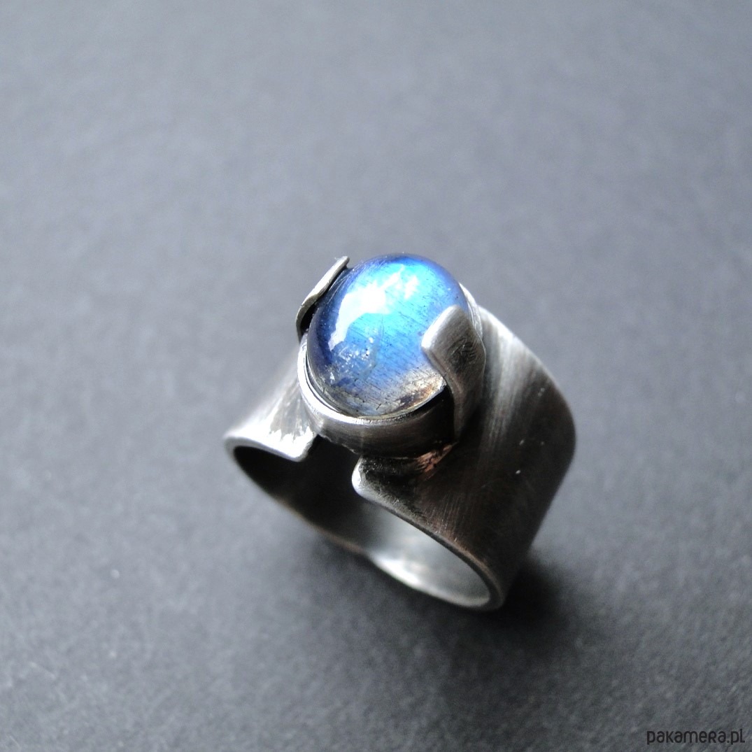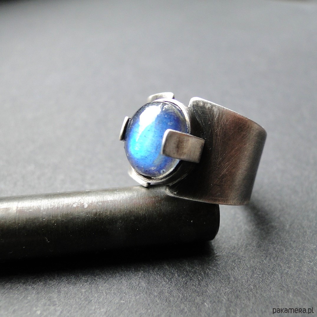 Surowy, masywny pierścień z pięknym kamieniem. Wykonany ręcznie od podstaw ze srebra pr.925.Oksydowane i szorowany. Surowe wykończenie. Kamień: okazały, naturalny labradoryt wym.10x8mm z mocną niebieską polaryzacją. Pierścień regulowany w r.15. Przy tej szerokości obrączki pasuje na rozmiar 14. Nie moczyć w wodzie. Pierścień w unikatowym egzemplarzu.