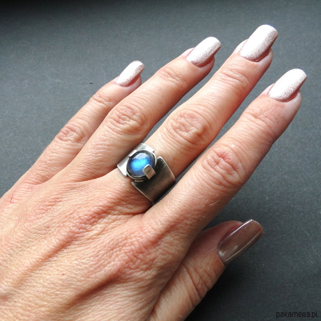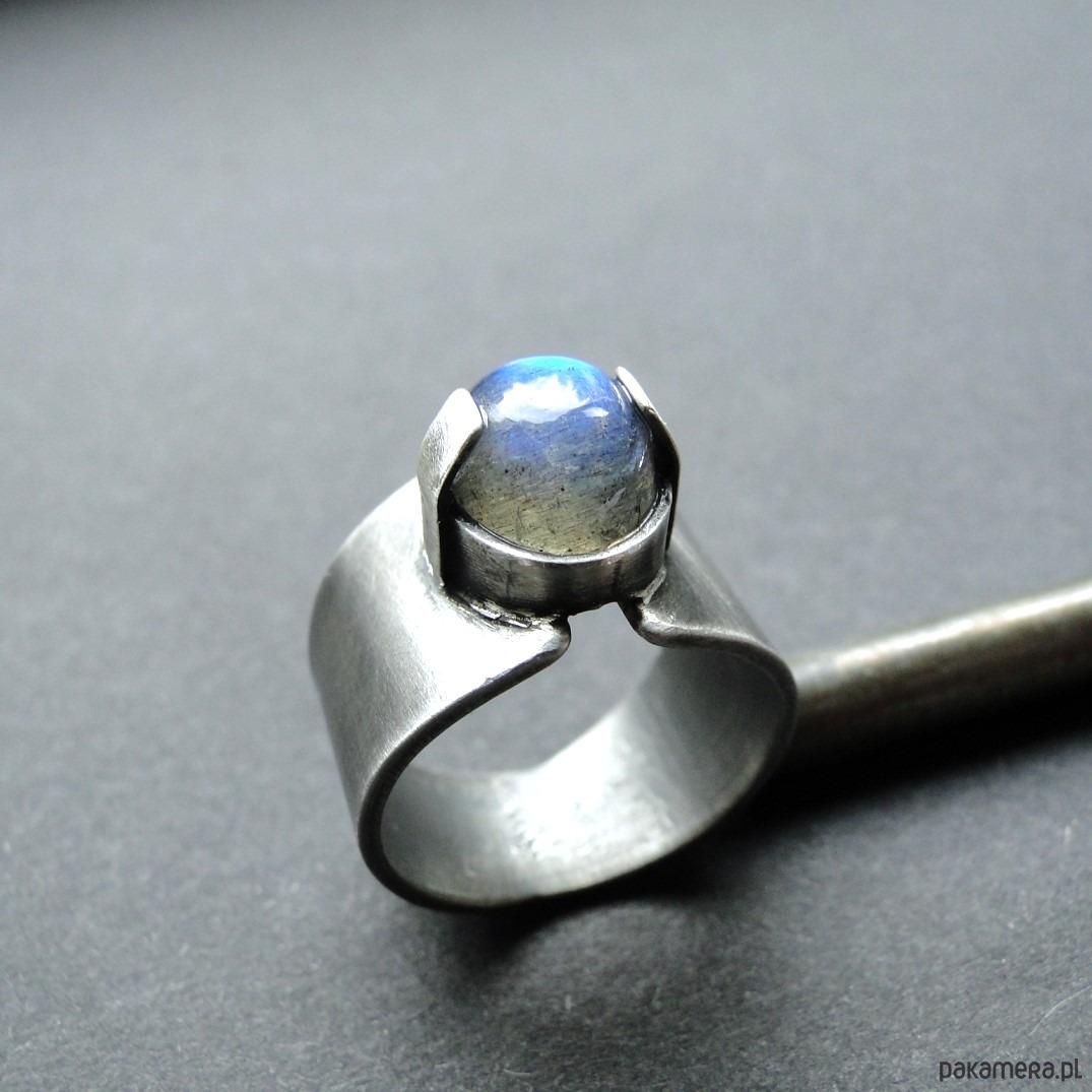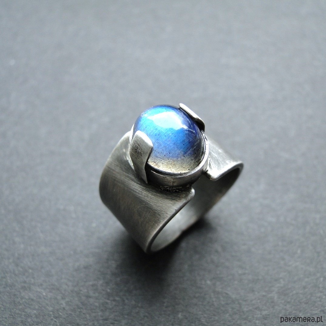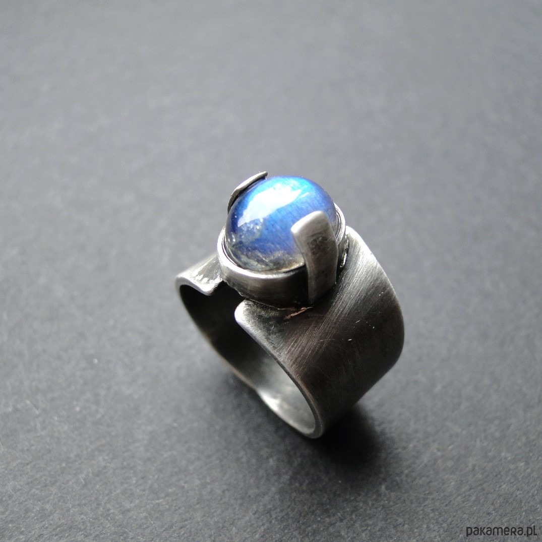 Surowy, masywny pierścień z pięknym kamieniem. Wykonany ręcznie od podstaw ze srebra pr.925.Oksydowane i szorowany. Surowe wykończenie. Kamień: okazały, naturalny labradoryt wym.10x8mm z mocną niebieską polaryzacją. Pierścień regulowany w r.15. Przy tej szerokości obrączki pasuje na rozmiar 14. Nie moczyć w wodzie. Pierścień w unikatowym egzemplarzu.