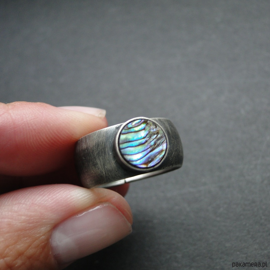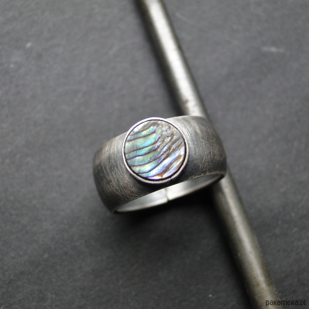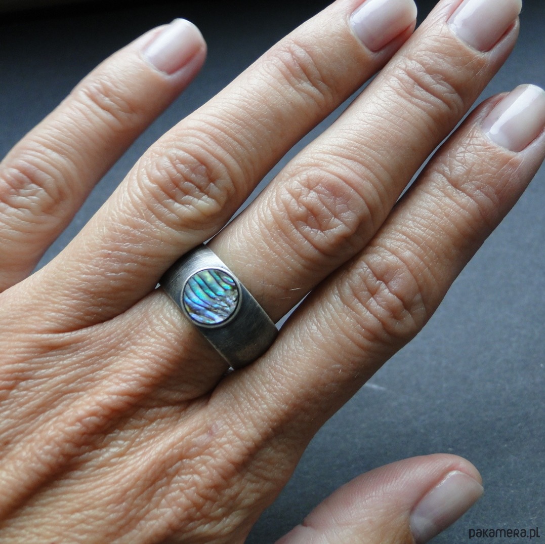 Surowy pierścionek wykonany ręcznie w mojej pracowni. Srebro pr. 930, oksydowane i przecierane. Piękna muszla Pinctada Margaritifera o średnicy 8,5 cm. Muszla jest wielobarwna z przewagą zieleni i fioletu. Wklejana klejem złotniczym. Rozmiar jubilerski- 16. Pasuje na palec rozm.15. Pierścień idealny na lato. UNIKAĆ MOCZENIA W WODZIE.