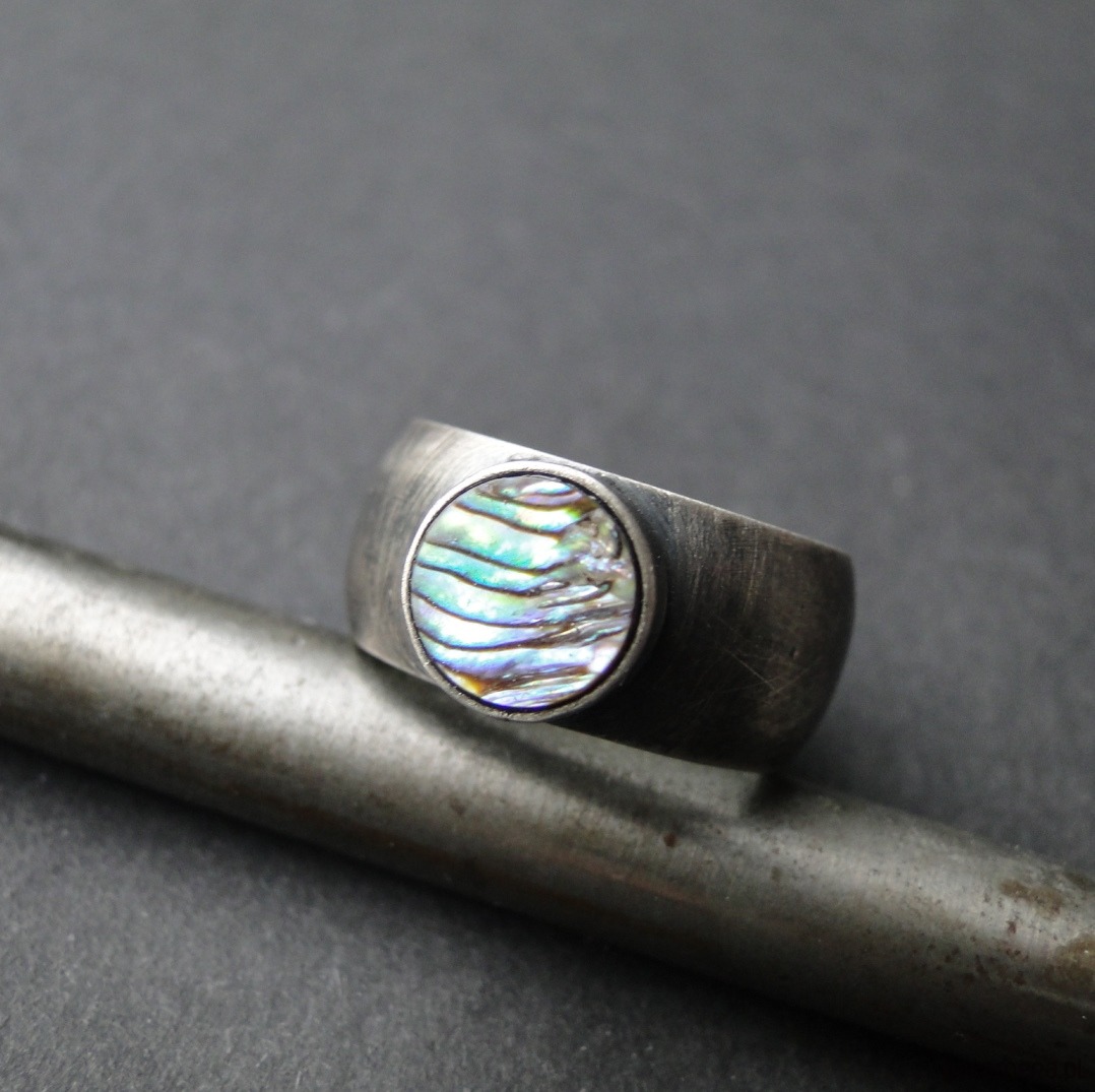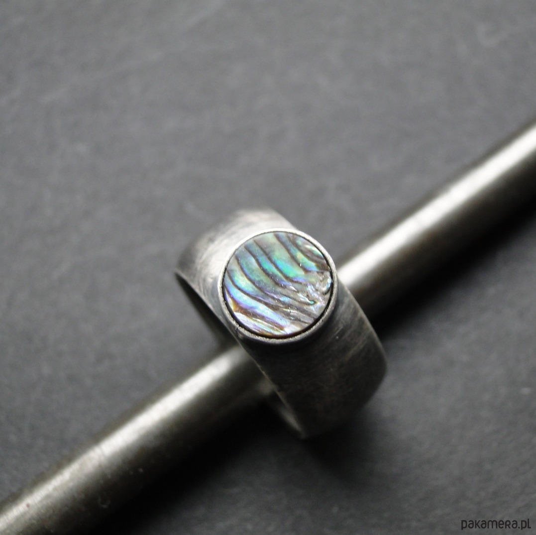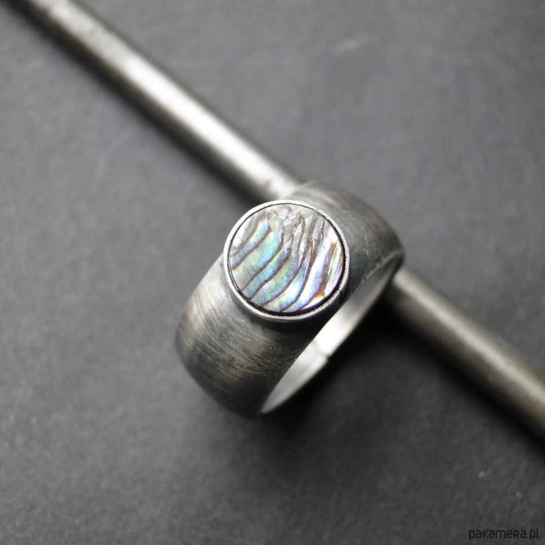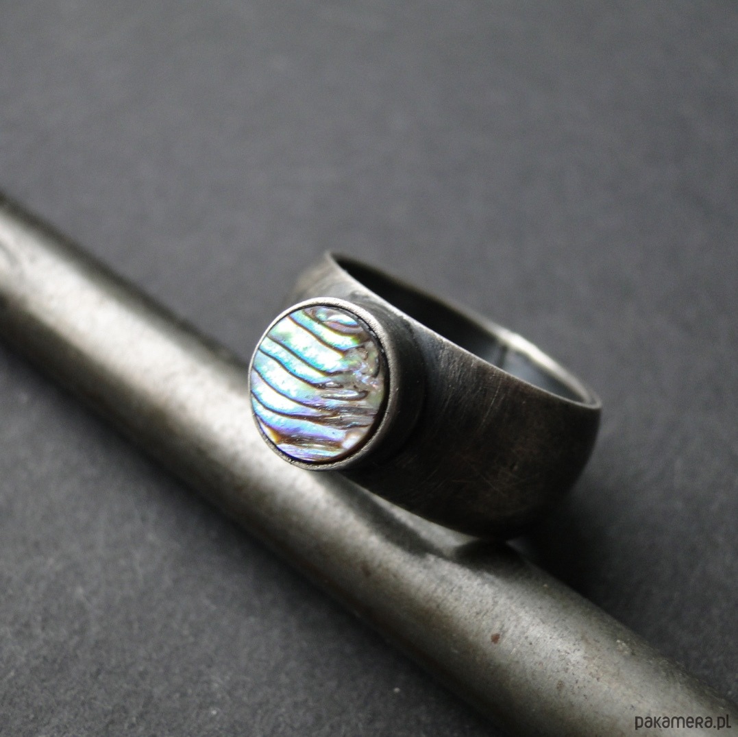 Surowy pierścionek wykonany ręcznie w mojej pracowni. Srebro pr. 930, oksydowane i przecierane. Piękna muszla Pinctada Margaritifera o średnicy 8,5 cm. Muszla jest wielobarwna z przewagą zieleni i fioletu. Wklejana klejem złotniczym. Rozmiar jubilerski- 16. Pasuje na palec rozm.15. Pierścień idealny na lato. UNIKAĆ MOCZENIA W WODZIE.