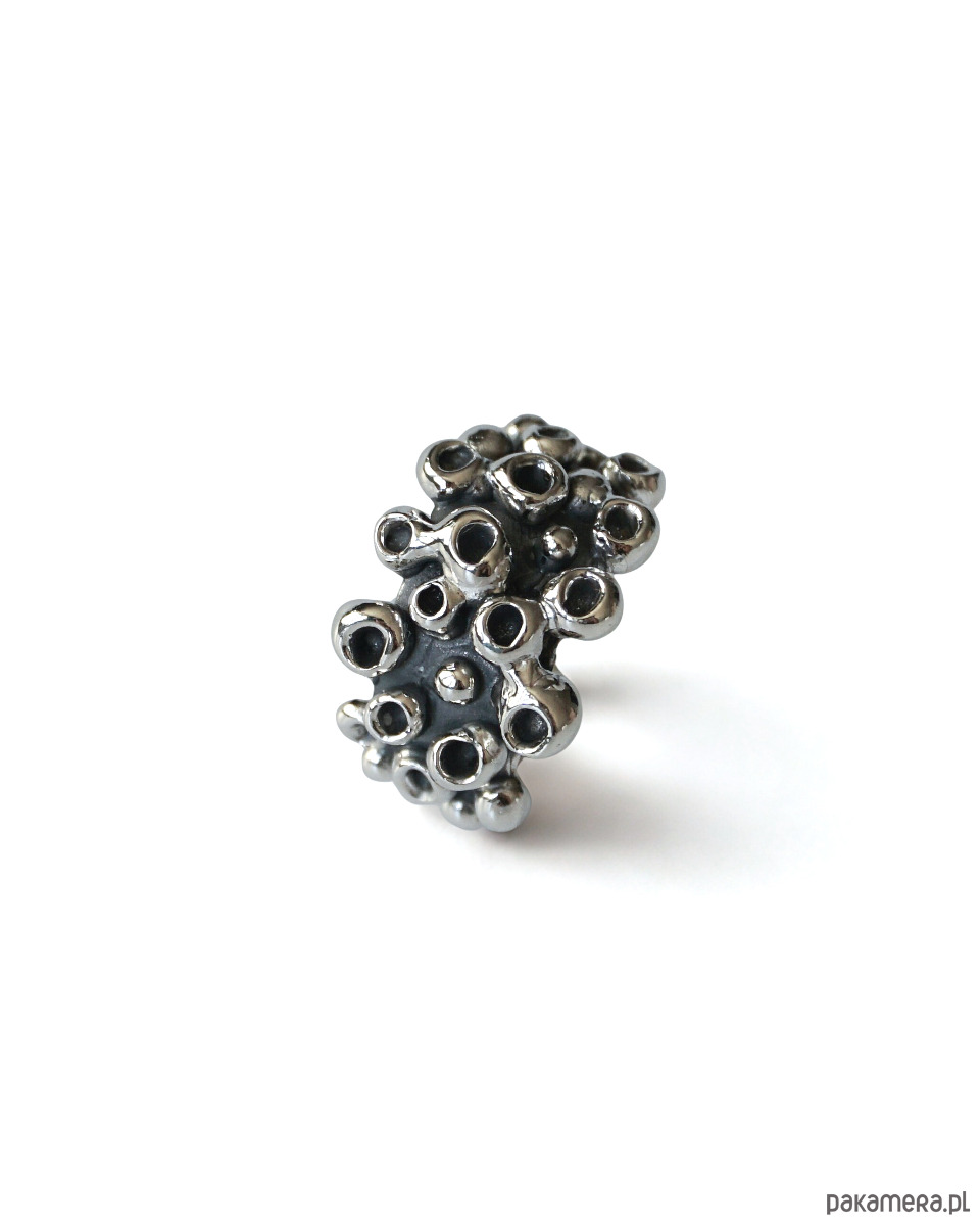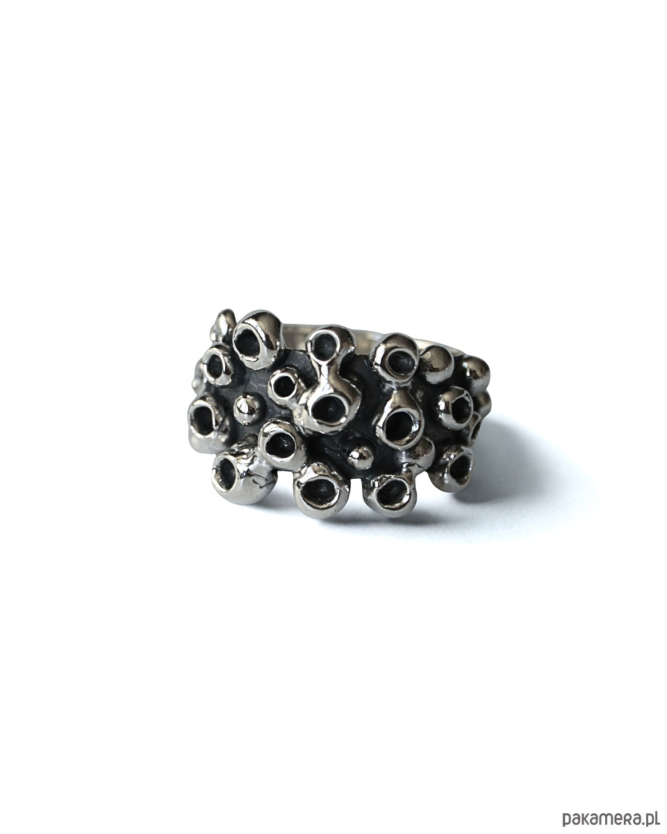 Srebrny oksydowany pierścionek inspirowany macką ośmiornicy. Wyrzeźbiony ręcznie w wosku, następnie odlany w srebrze próby 925 i ręcznie wykończony.