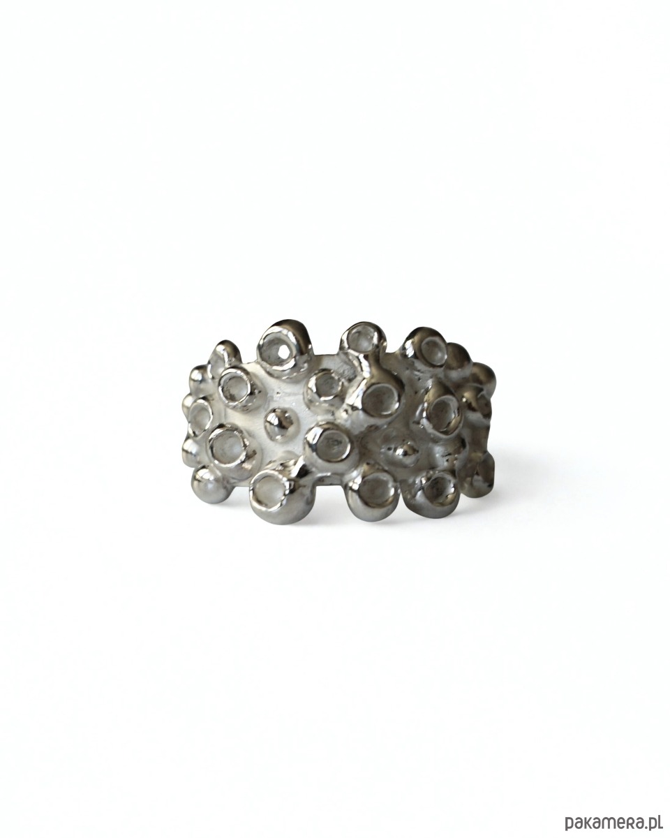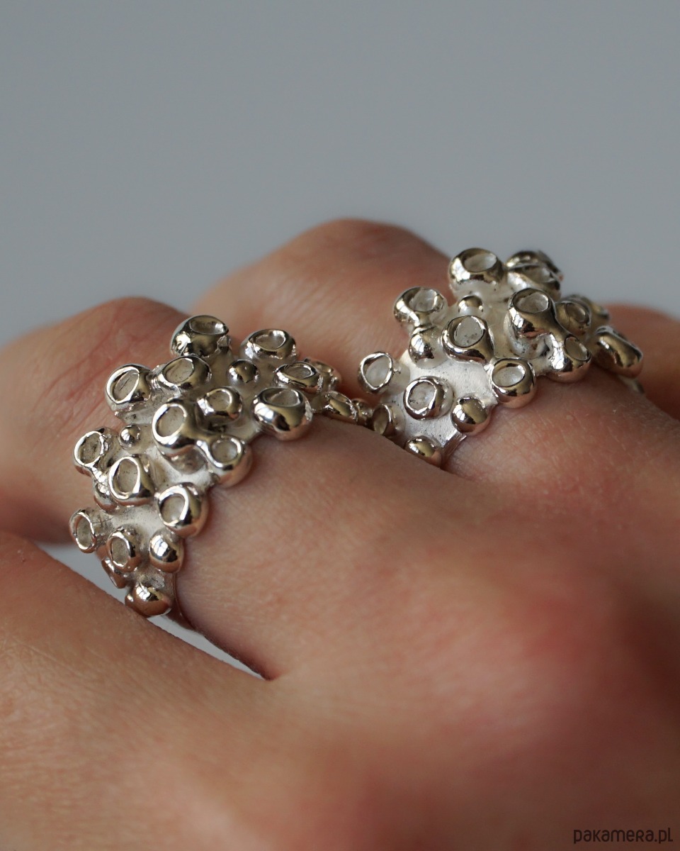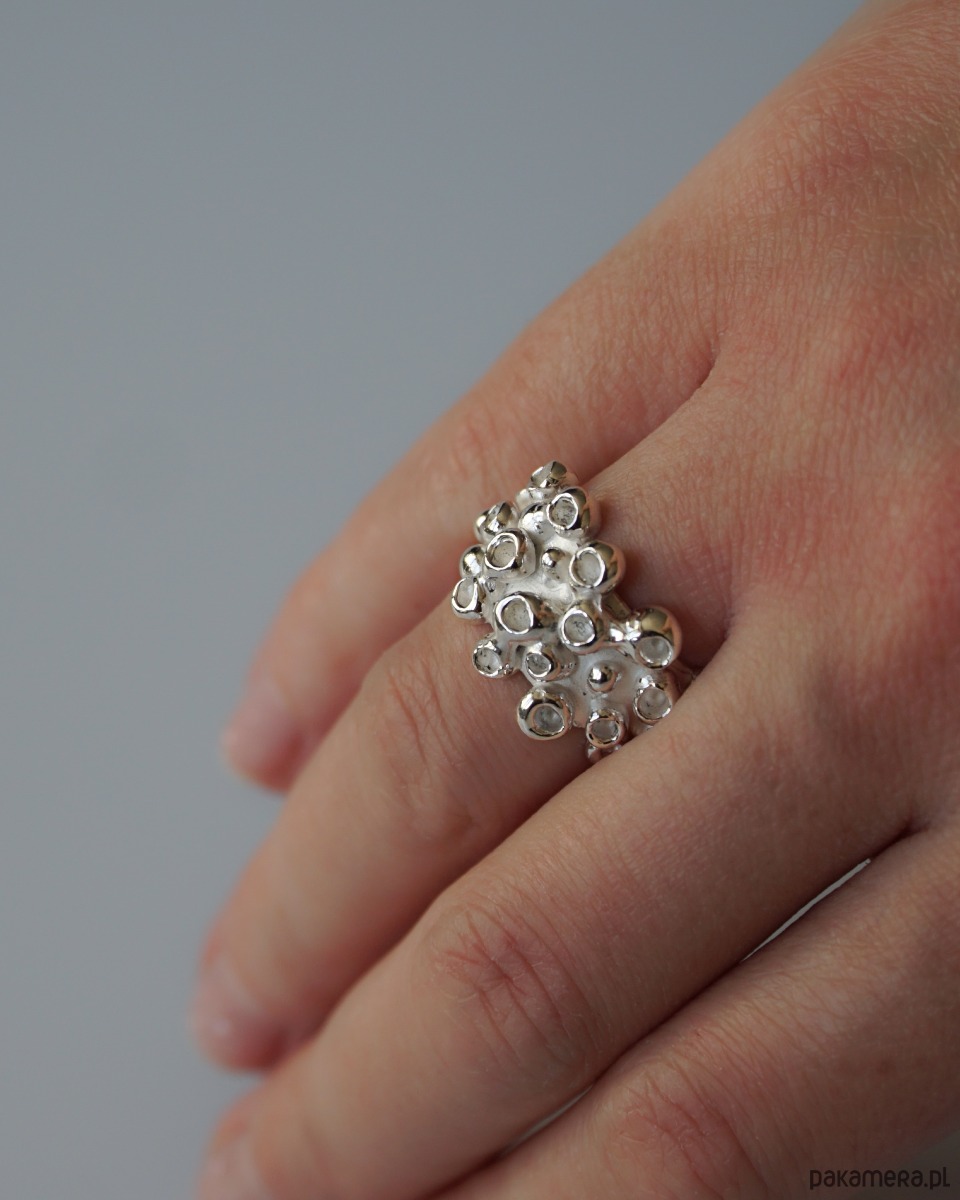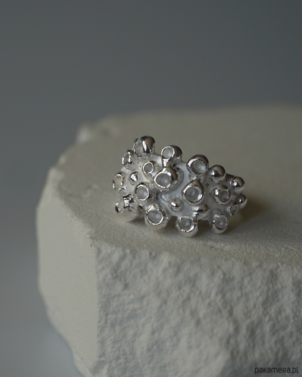 Masywny pierścionek o nieregularnej formie inspirowany macką ośmiornicy. Wyrzeźbiony ręcznie w wosku, następnie odlany w srebrze próby 925 i ręcznie wykończony.