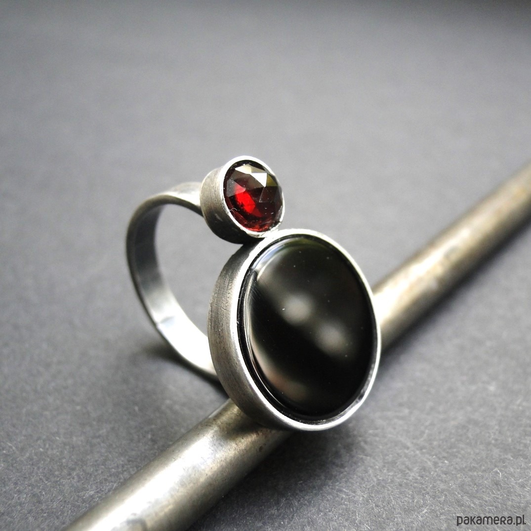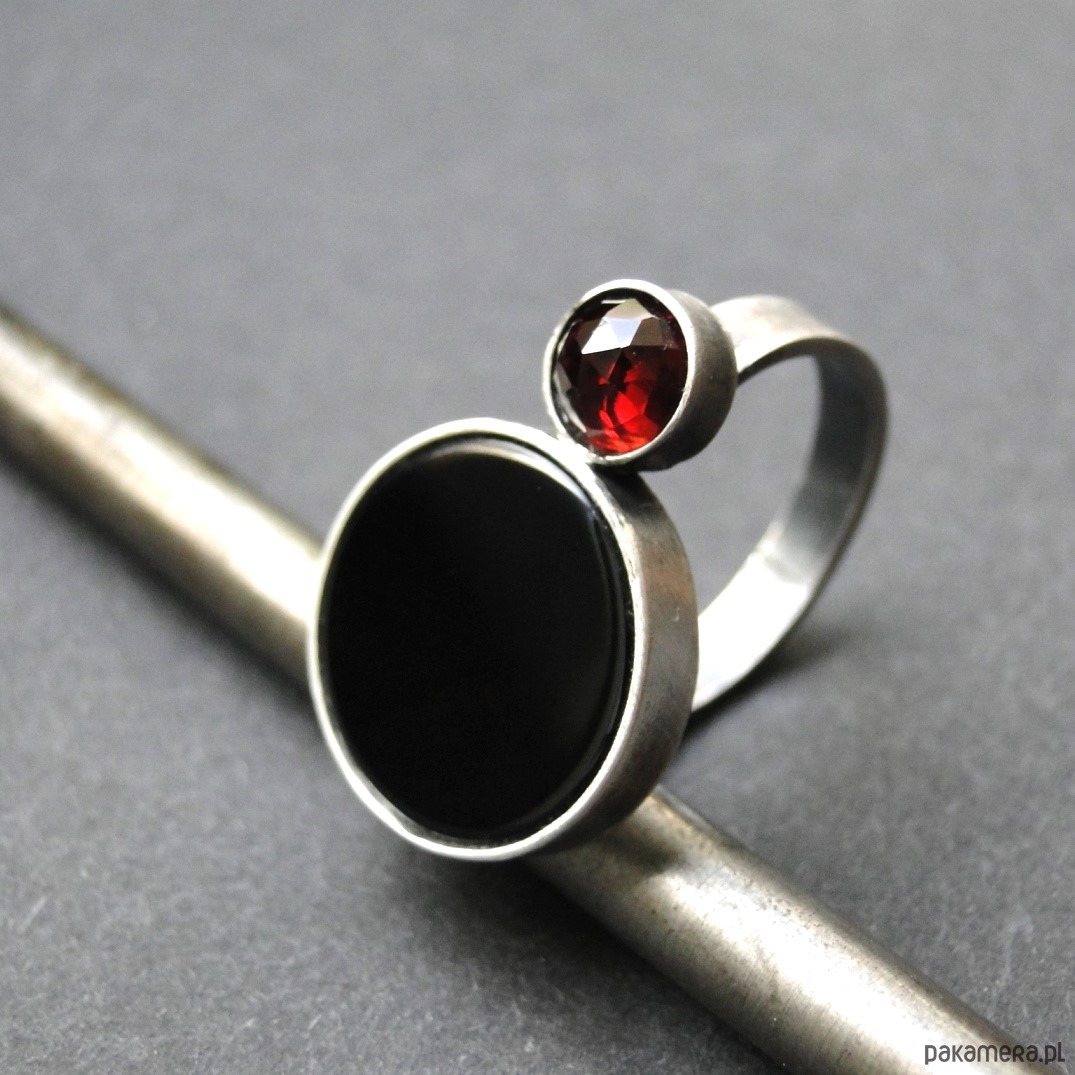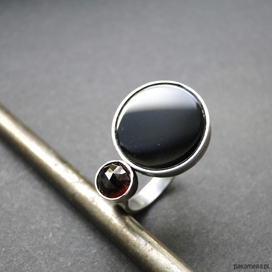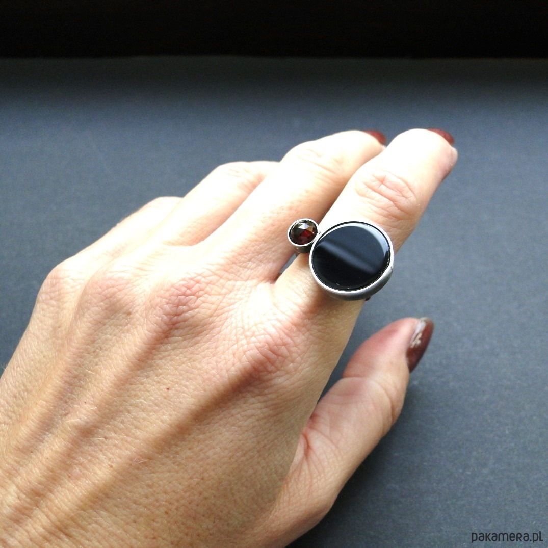 Minimalistyczny, geometryczny pierścień wykonany ręcznie od podstaw. Srebro 925,oksydowane i szorowane. Kamienie: czarny gładki onyks śr.16mm, naturalny fasetowany granat 6mm klasy A. Pierścień bez regulacji-pasuje na palec r.13. Nie moczyć w wodzie. Polecam sztyfty do zestawu (na zapytanie).
