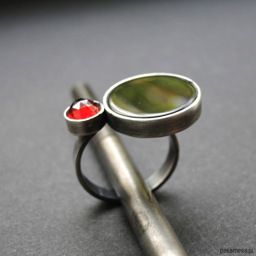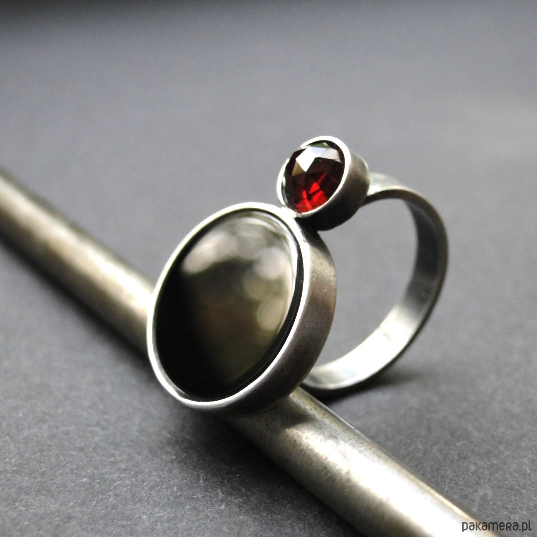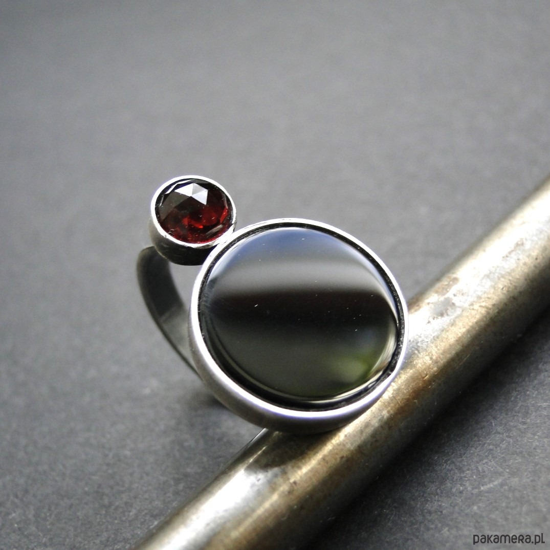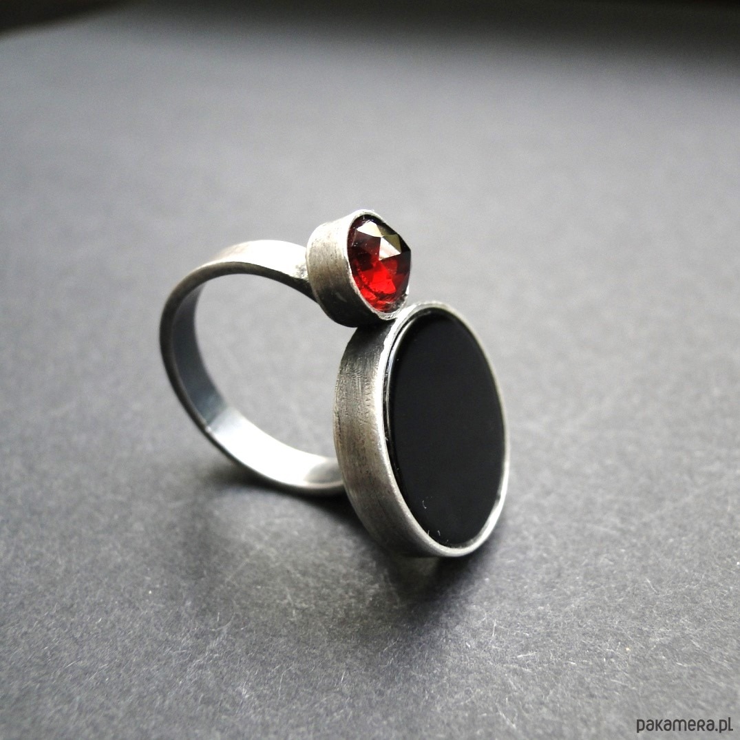 Minimalistyczny, geometryczny pierścień wykonany ręcznie od podstaw. Srebro 925,oksydowane i szorowane. Kamienie: czarny gładki onyks śr.16mm, naturalny fasetowany granat 6mm klasy A. Pierścień bez regulacji-pasuje na palec r.13. Nie moczyć w wodzie. Polecam sztyfty do zestawu (na zapytanie).