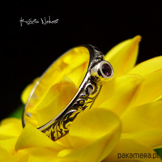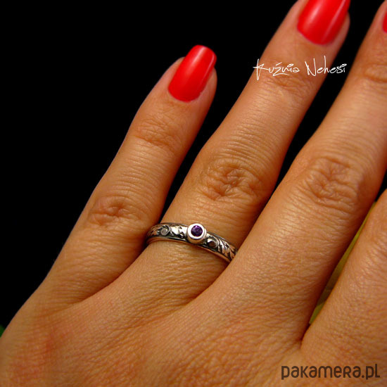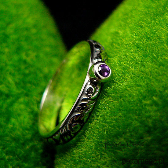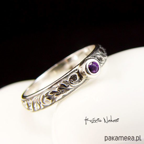 Delikatny pierścień z kolekcji ,, Z Ogrodu Elfów ,, cudnej urody purpurowy Ametyst o szlifie diamentowym, oprawiłam w srebro na przepięknej rzeźbionej obrączce w florystyczne wzory. Zdjęcie nie oddaje uroku kamienia. Pierścień oksydowany, wypolerowany na wysoki połysk. Rozmiar obrączki 13,5 ( 17 milimetra) ... mogę wykonać dla Ciebie w dowolnym rozmiarze na zamówienie - napisz do mnie :)