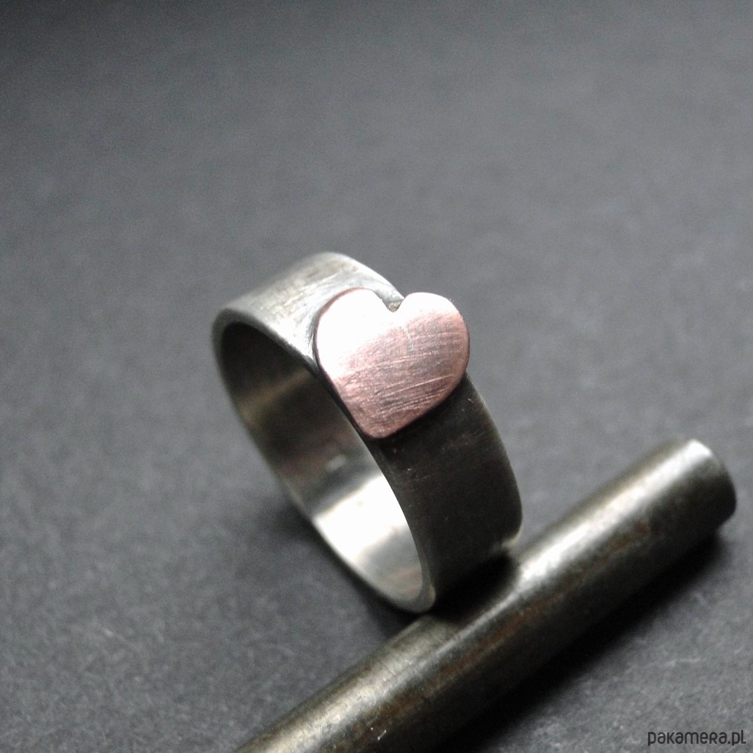Surowy, zabawny pierścionek wykonany ręcznie ze srebra pr.925 oraz miedzi. Oksydowany i szorowany. Szerokość obrączki-6mm. Pierścionek pasuje na pa palec r.12. Połączenie srebra i miedzi sprawia że pierścionek ulega naturalnej oksydacji-gdy chcemy go rozjaśnić ,wystarczy poszorować nową gąbką do naczyń (zielona strona).