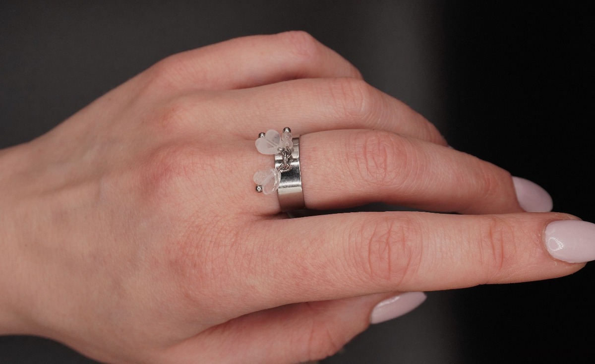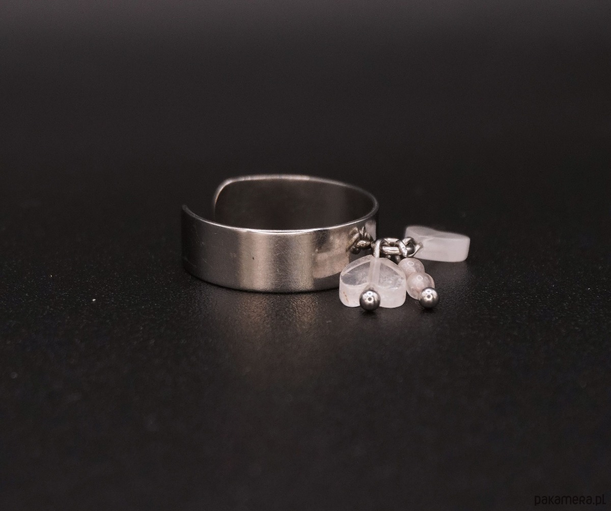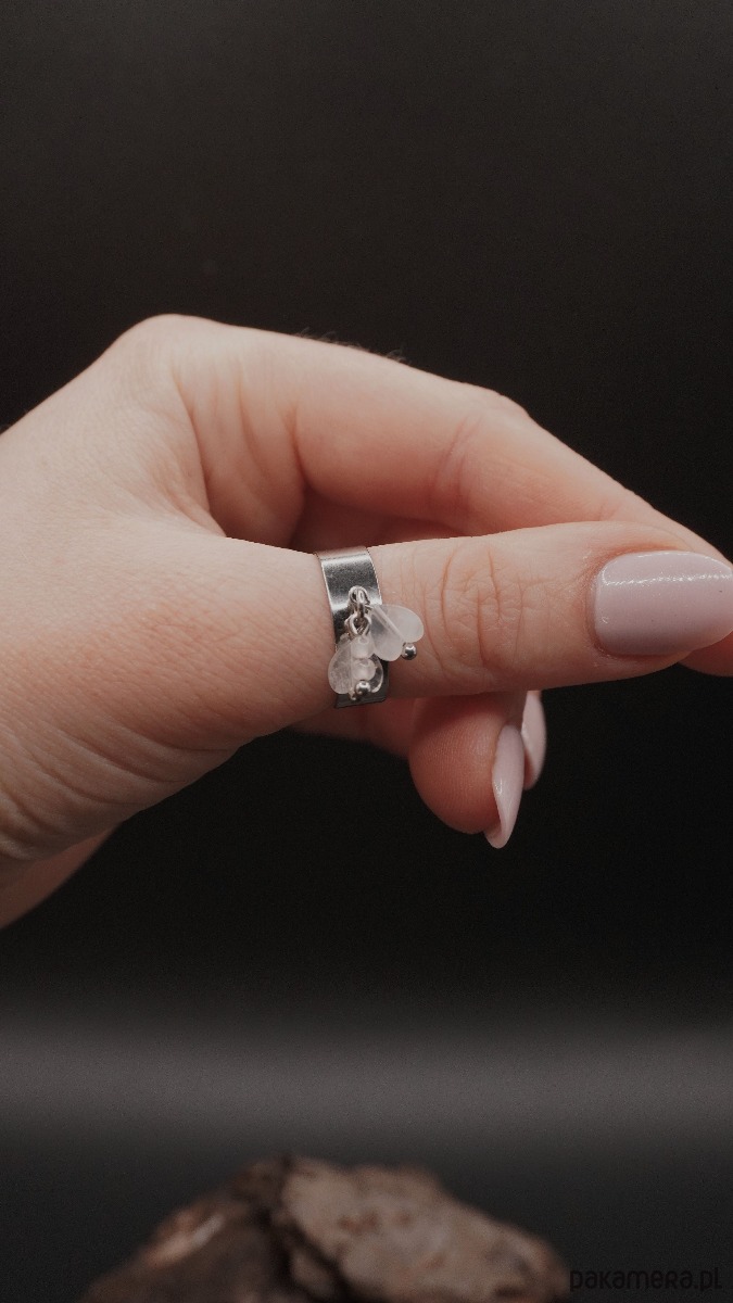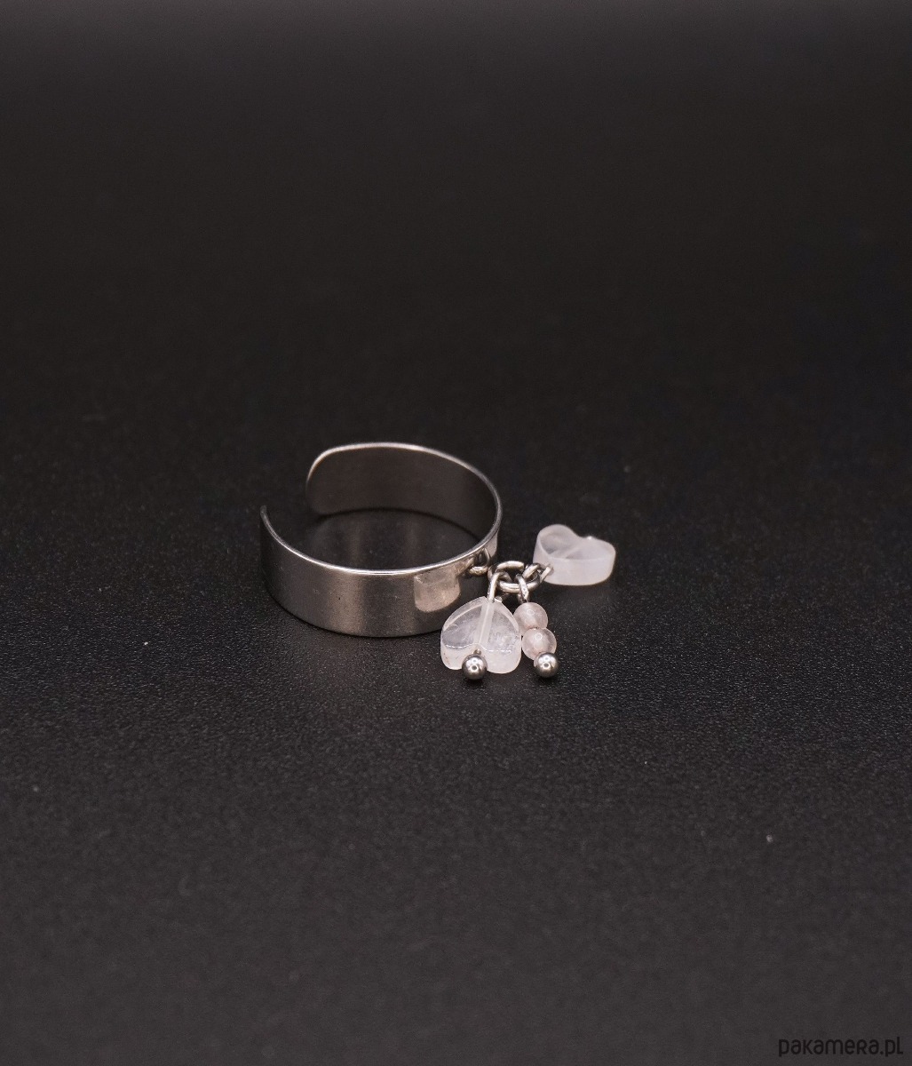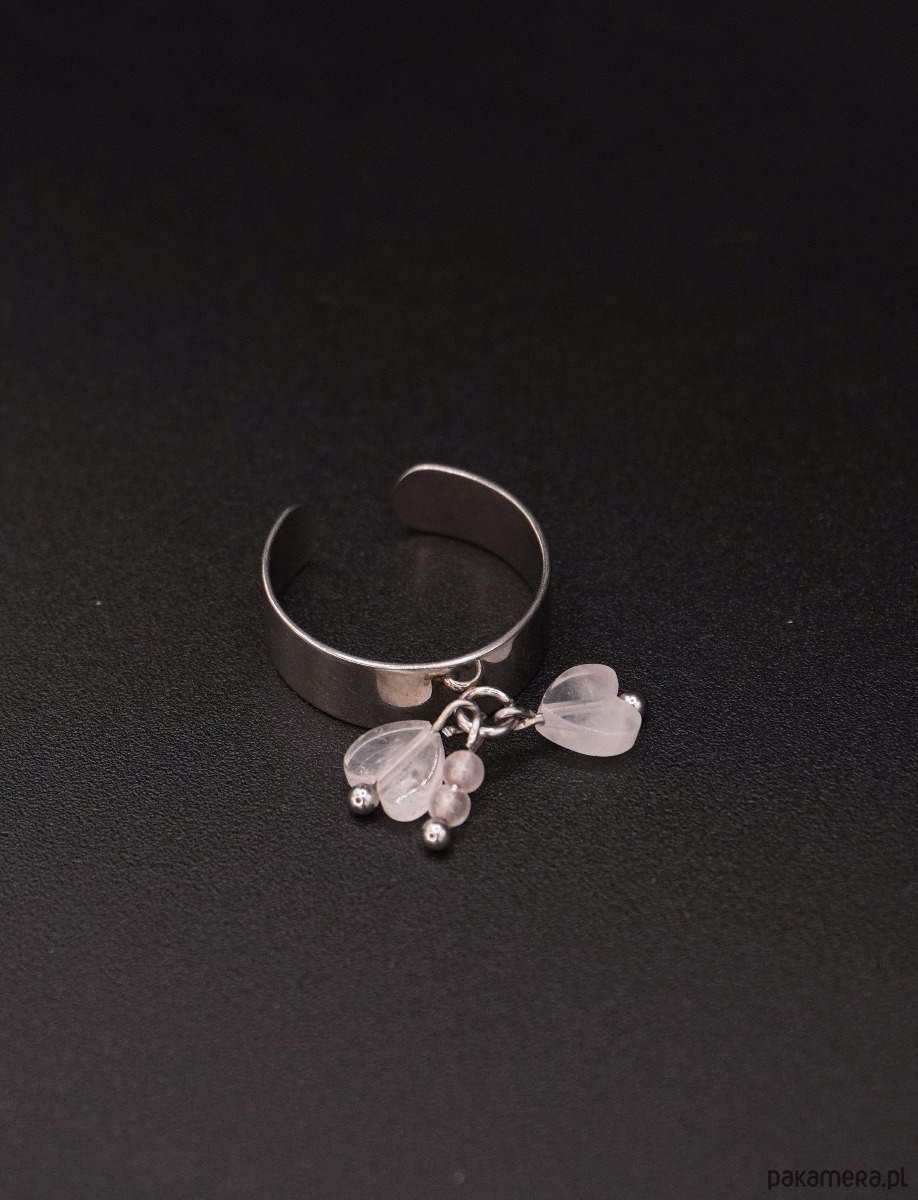 Oryginalny, szeroki pierścionek wykonany z wysokiej jakości metalu, ozdobiony subtelnymi zawieszkami z naturalnego kwarcu różowego. To połączenie surowej, nowoczesnej formy z delikatnością kamieni w kształcie serc.