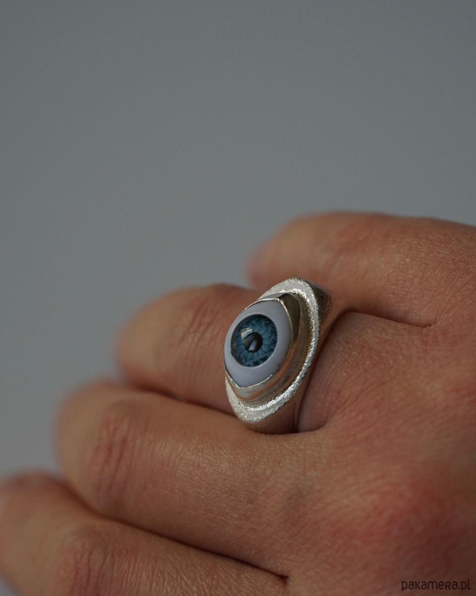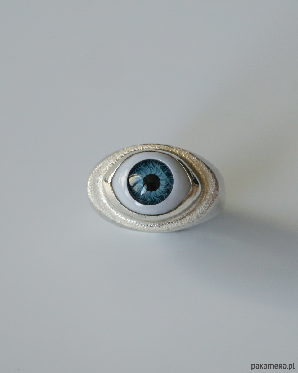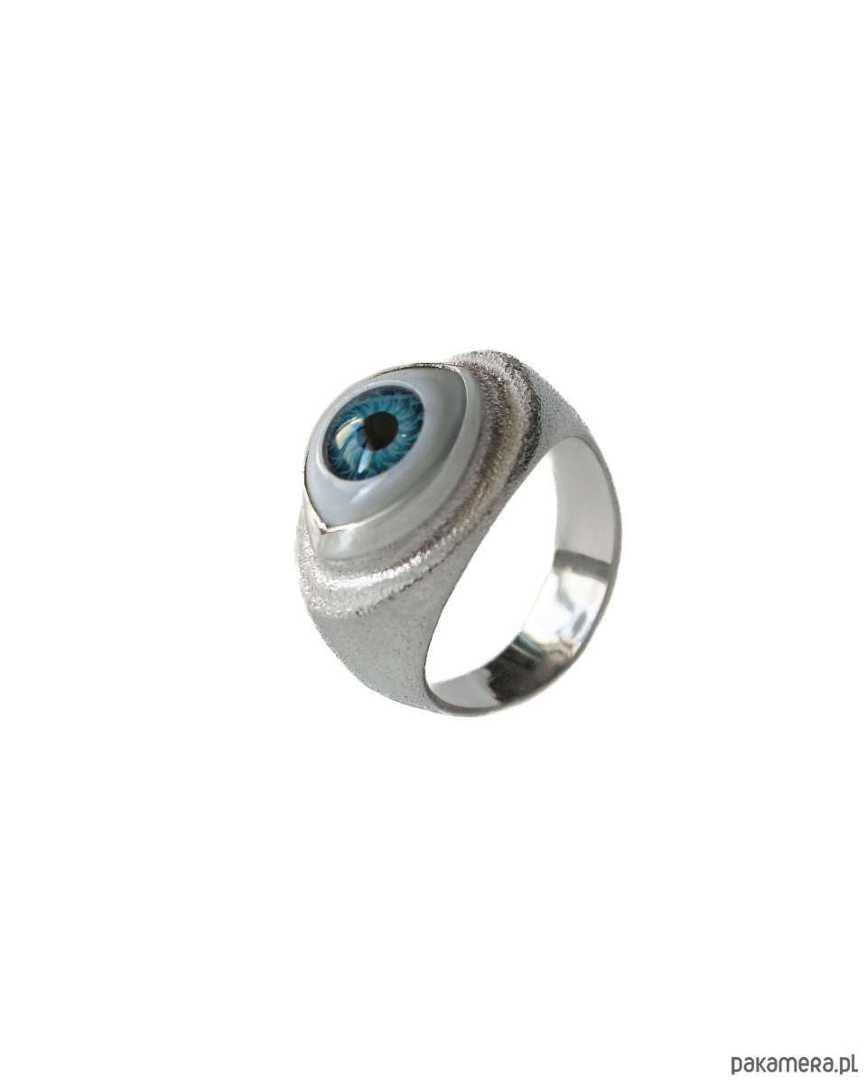 Srebrny fakturowany sygnet z motywem niebieskiego oka