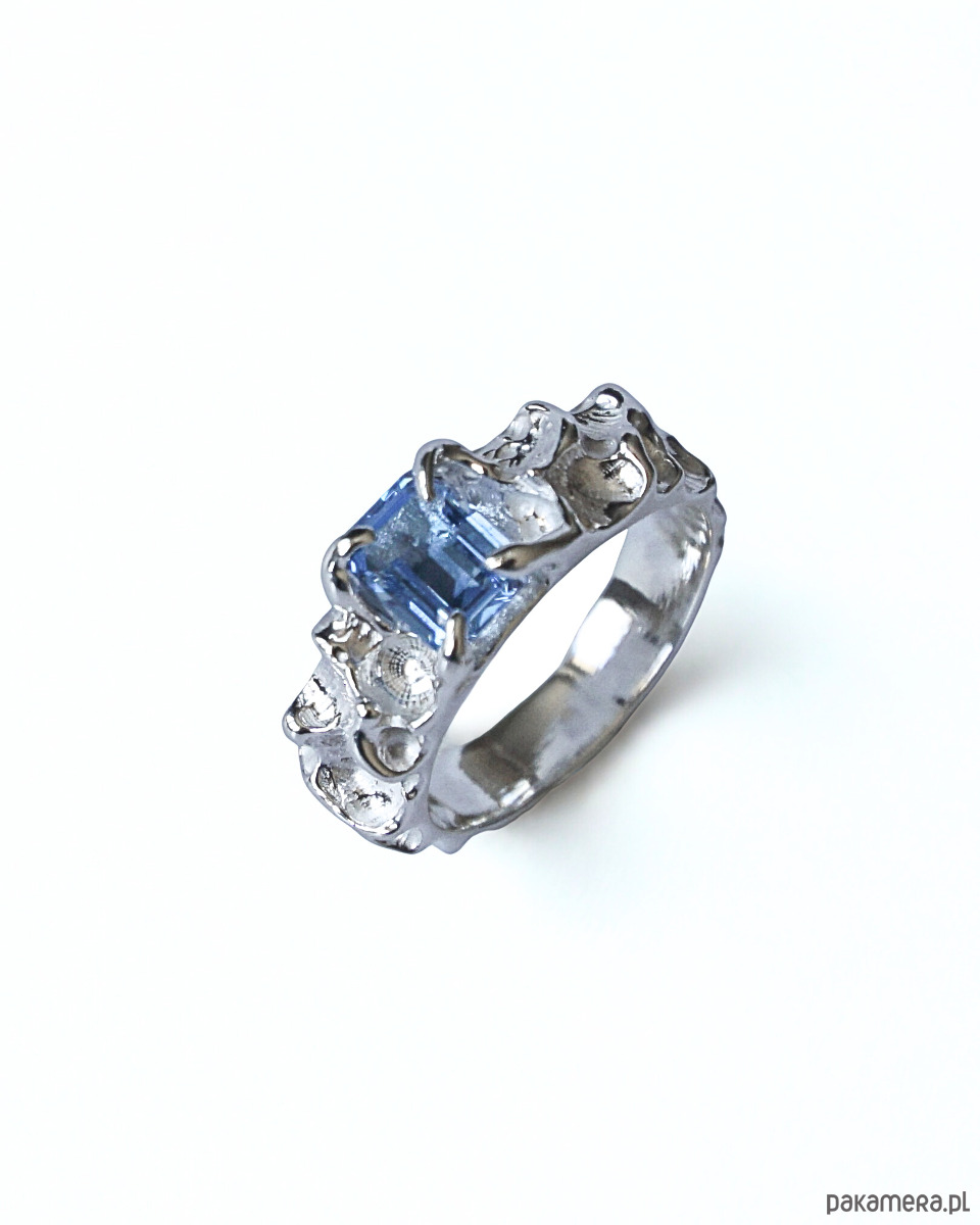 Srebrny nieregularny pierścionek z topazem. Wyrzeźbiony ręcznie w wosku, następnie odlany w srebrze próby 925 i ręcznie wykończony.
