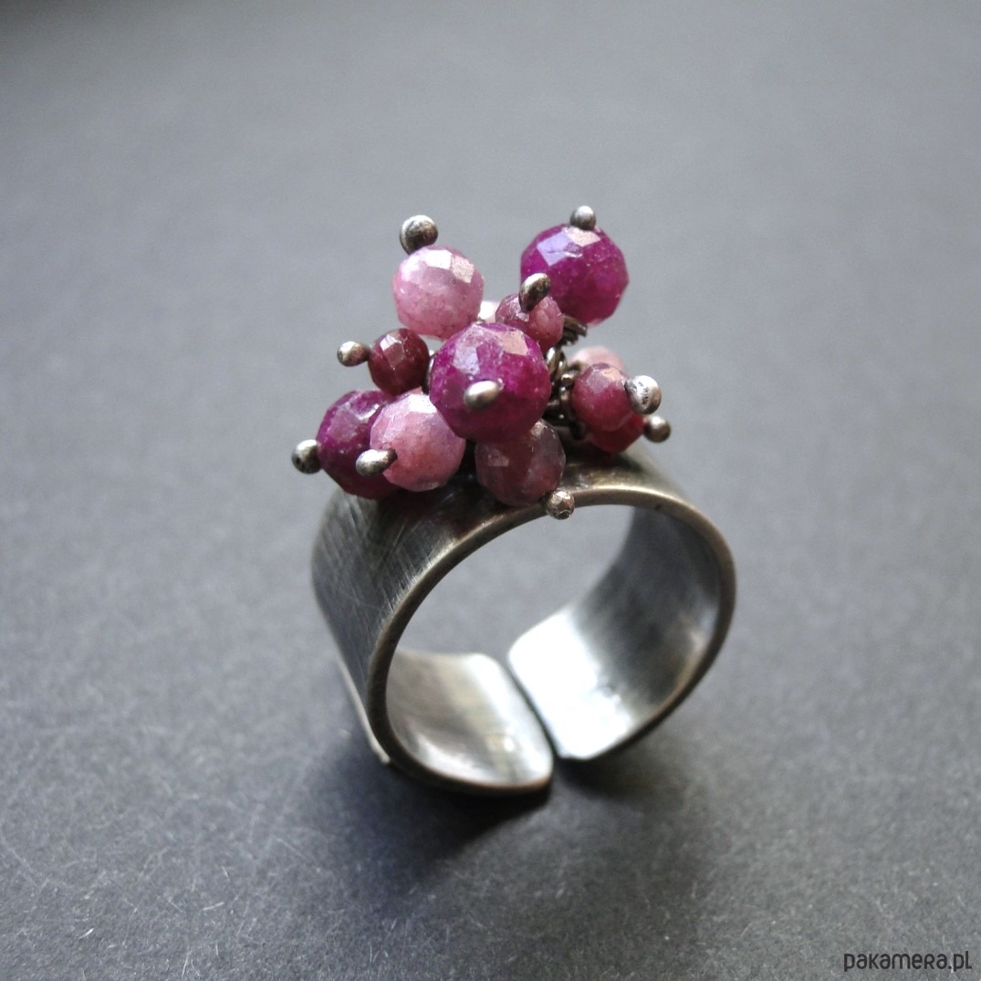 Awangardowy pierścień wykonany ręcznie od podstaw,zarówno obrączka jak i szpileczki.Srebro 925,oksydowane i szorowane. Surowa, gładka obrączka szer. 10,5mm. Kamienie: półsurowe rubiny i turmaliny od 3 do 6 mm. Kamienie dość luźno ułożone. Pierścień lekko regulowany. Pasuje na palec r.13. Nie moczyć w wodzie. Pierścień dość delikatny,raczej na większe wyjście.