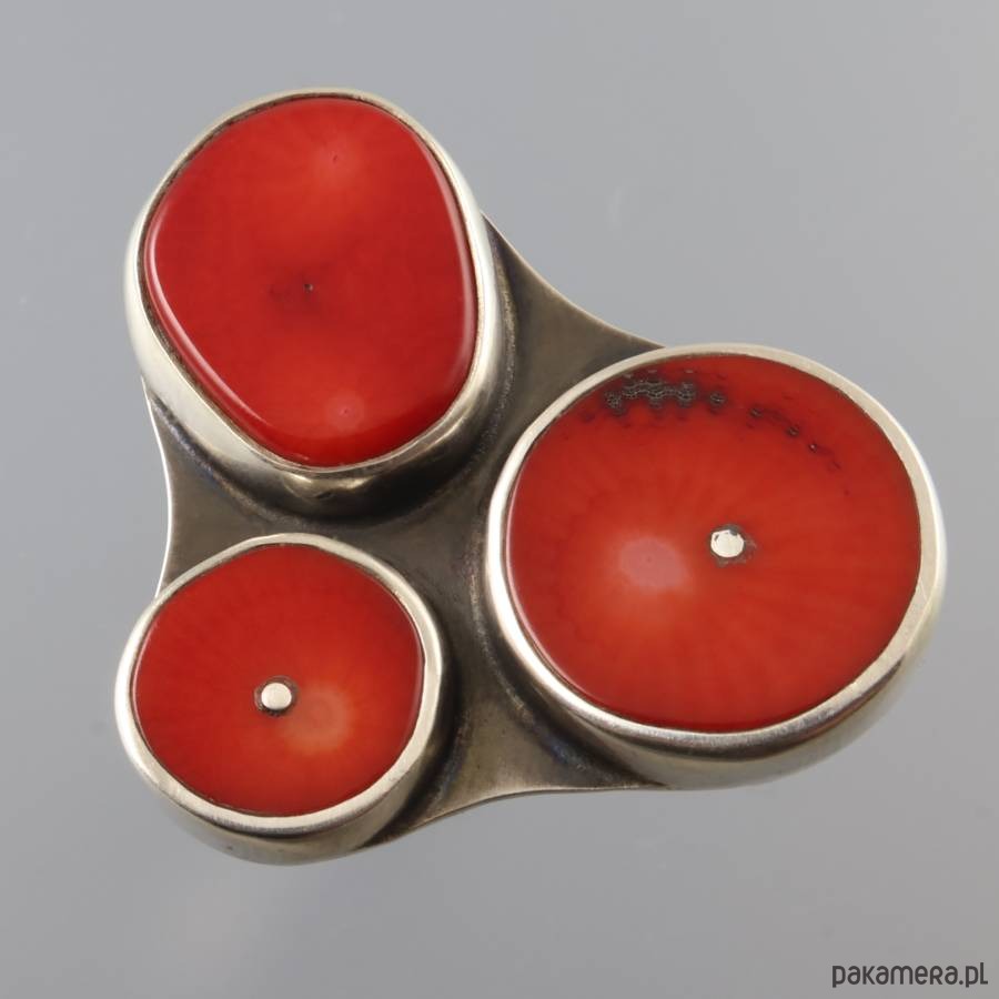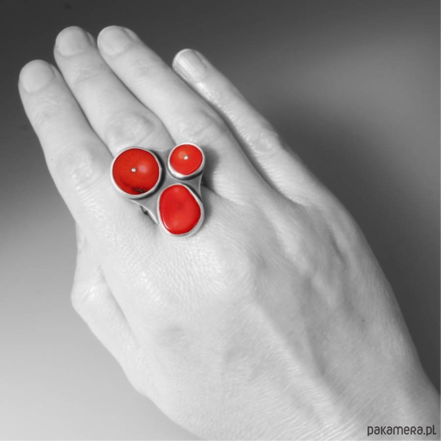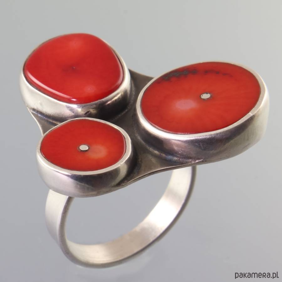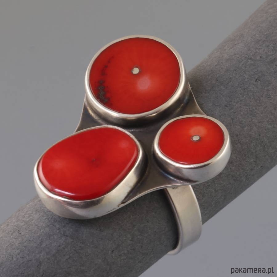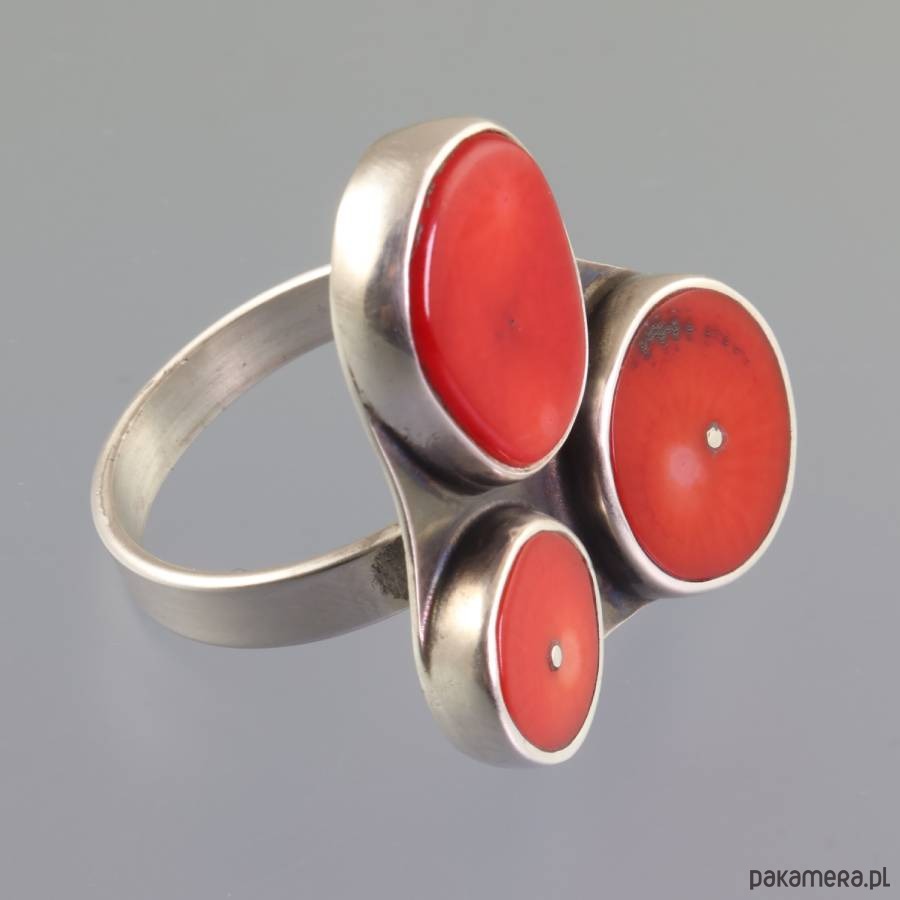 Ręcznie wykonany srebrny pierścionek z koralami. Srebro próby 925 - próba wybita na spodzie. Wymiary korony pierścionka: 3,0 cm x 2,7 cm. Rozmiar obrączki regulowany, rozmiar wyjściowy 17 (średnica wewnętrzna 1,8 cm). Waga pierścionka: 10,0 g.