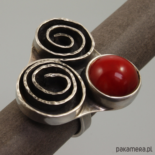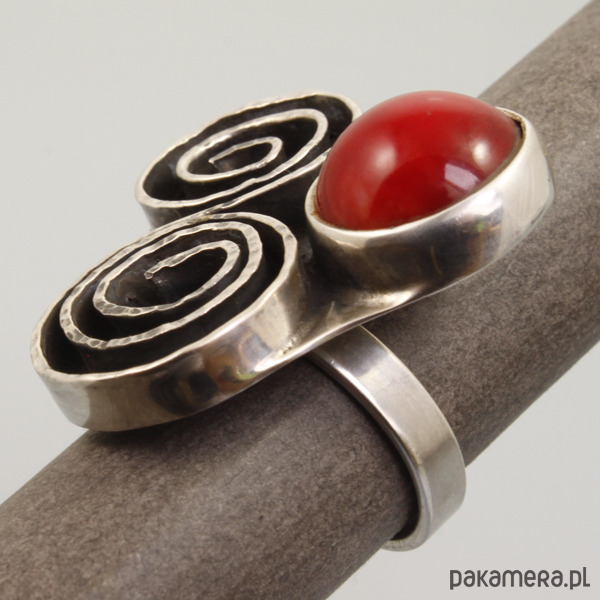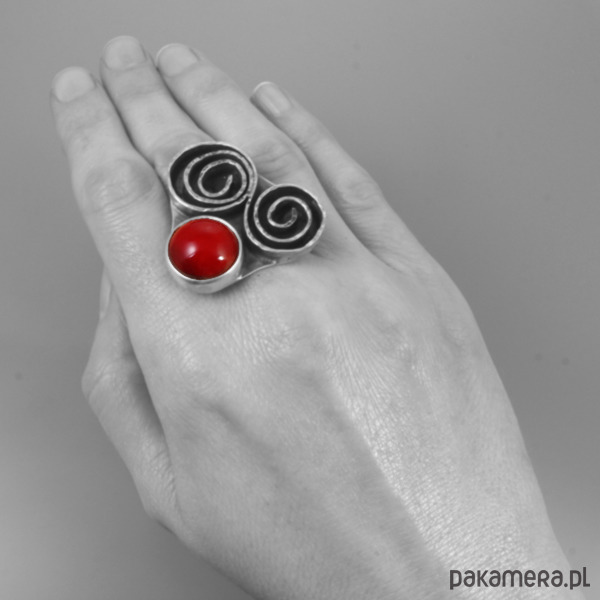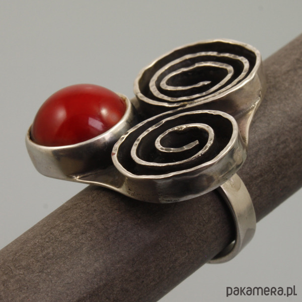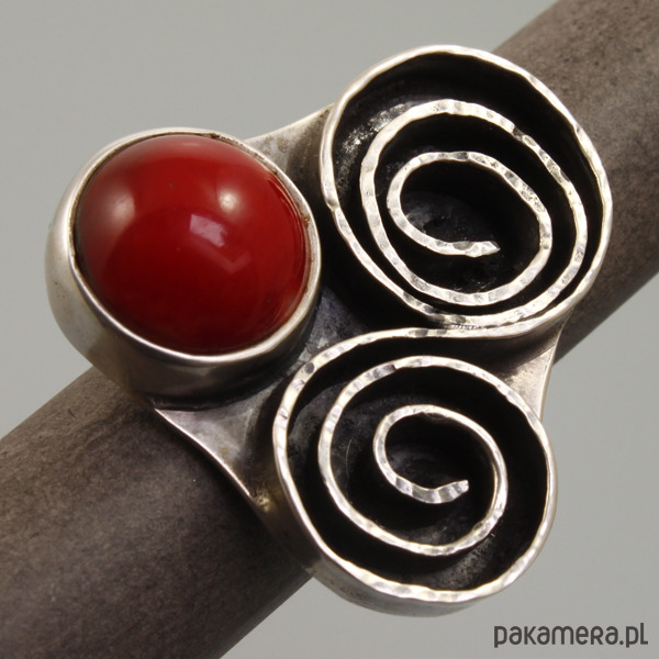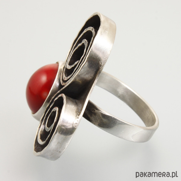 Ręcznie wykonany srebrny pierścionek z koralami. Srebro próby 925 - próba wybita na spodzie. Wymiary korony pierścionka: 3,2 cm x 3,2 cm. Średnica korala 1,6 cm. Rozmiar obrączki: regulowany, rozmiar wyjściowy 19 (średnica wewnętrzna 18,6 mm). Waga pierścionka: 16,2 g.