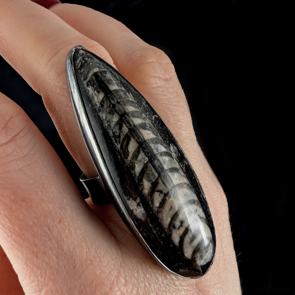 Smukły, awangardowy pierścień z ciekawym, naturalnym łodzikiem (orthoceras) oprawionym w oksydowane srebro 925. Wymiary oprawy 55 x 18 mm . Rozmiar jubilerski 19 EU, mogę powiększyć na max. 20 EU .Waga 22 gramy, polecam !