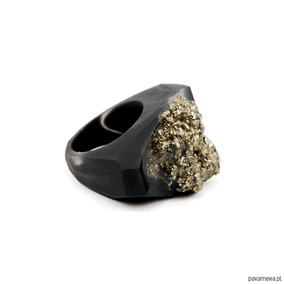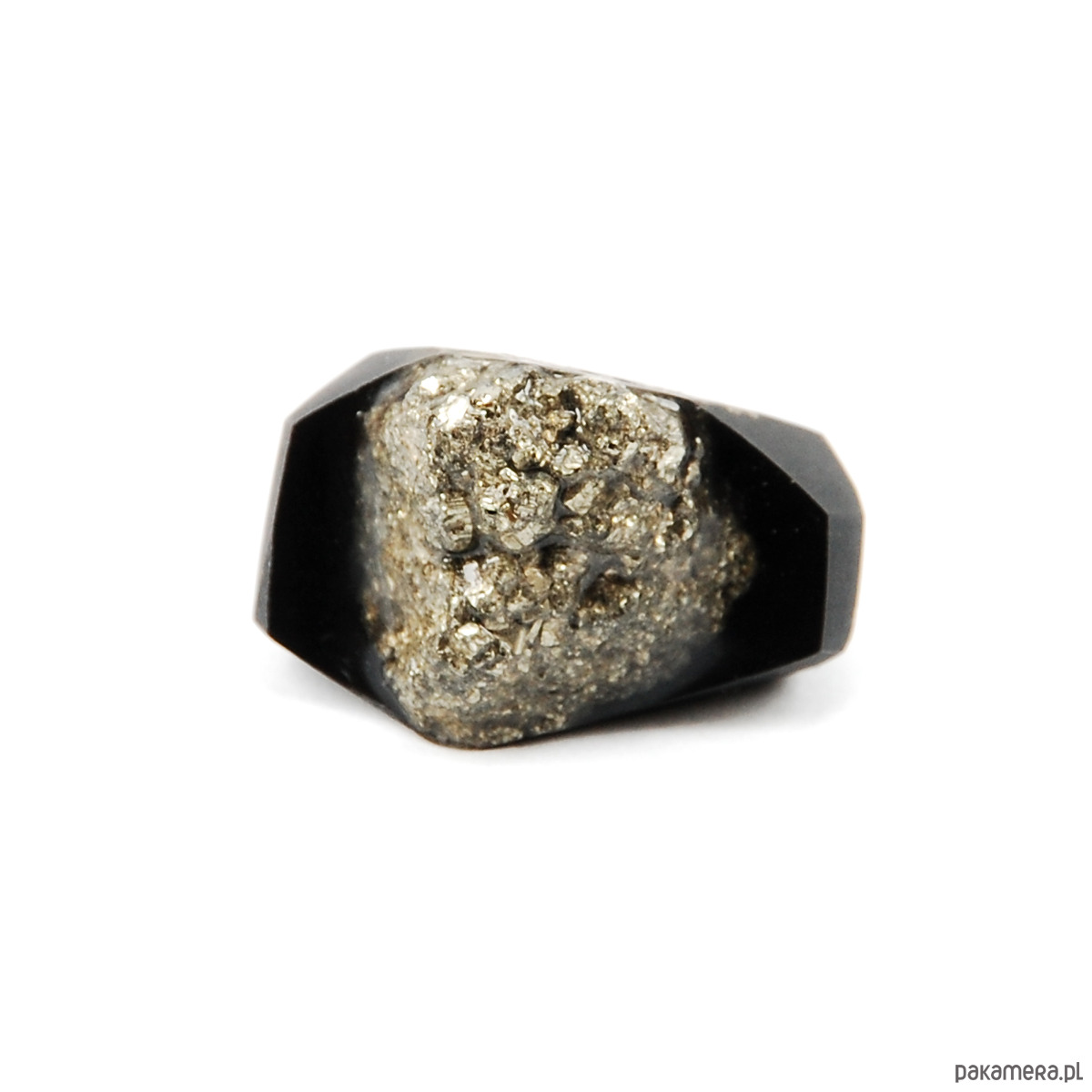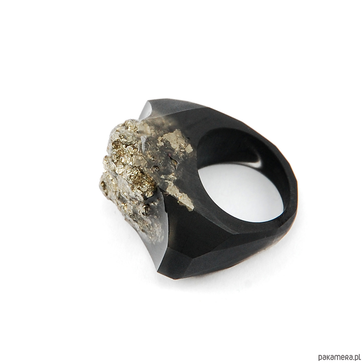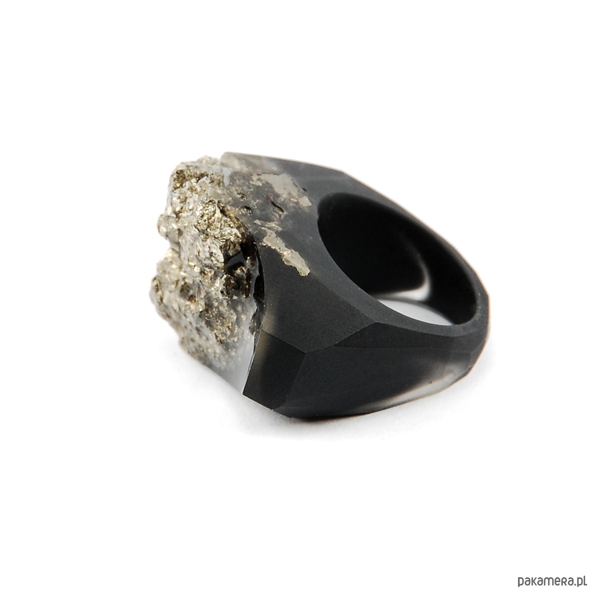 Pierścionek z naturalnym kamieniem- pirytem. Kamień został oprawiony w czarną żywicę jubilerską.
