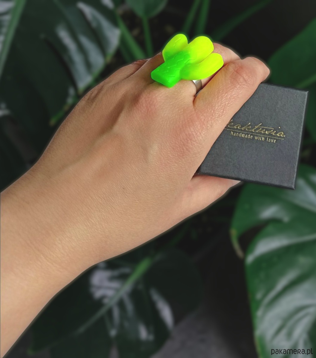Niezwykle efektowny, niepoważny pierścionek - kaktus - w neonowych kolorach, z efektem ombre.