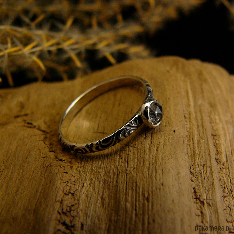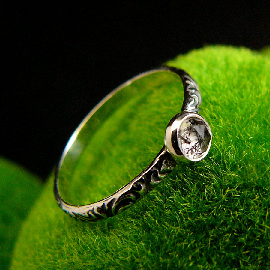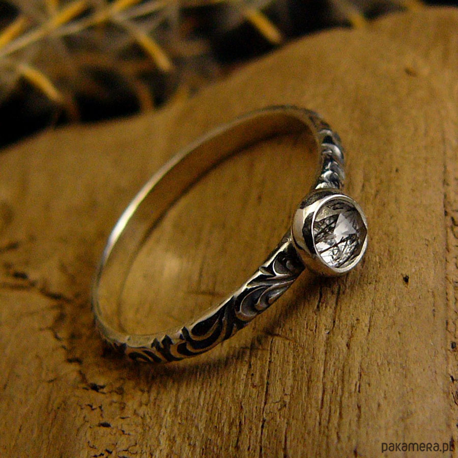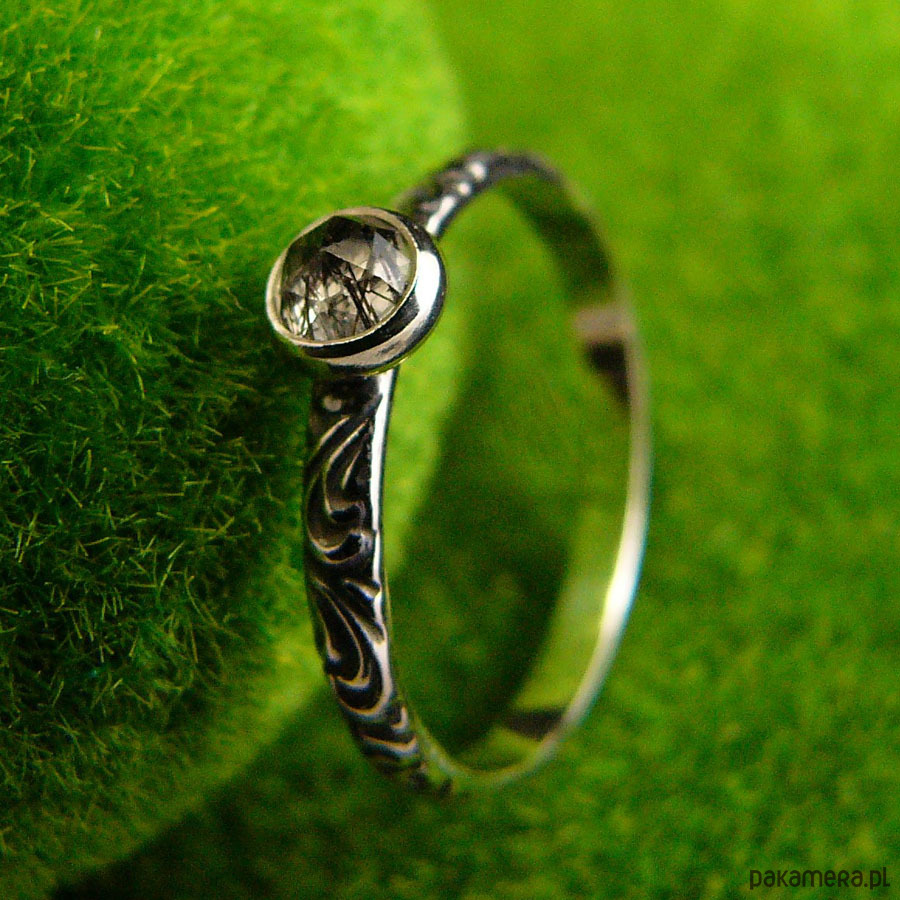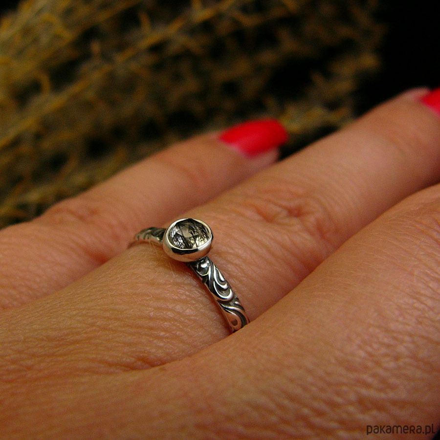 Uroczy drobiazg – pierścień z kolekcji ,, Z Ogrodu Elfów ,, sercem jest przepięknej urody naturalny fasetowany Kwarc z niteczkami czarnego Turmalinu, zakuty został na przepięknej rzeźbionej obrączce w florystyczne wzory. Zdjęcie nie oddaje w pełni barwy kamienia, jest w 100% naturalny. Pierścień wykonany ze srebra 925, ręcznie oksydowany, cechowany wypolerowany na wysoki połysk. Rozmiar obrączki 13,5 ( 17 milimetra). Nie Twój rozmiar? nic nie szkodzi, mogę go powiększyć lub zmniejszyć dla Ciebie na zamówienie – napisz do mnie.