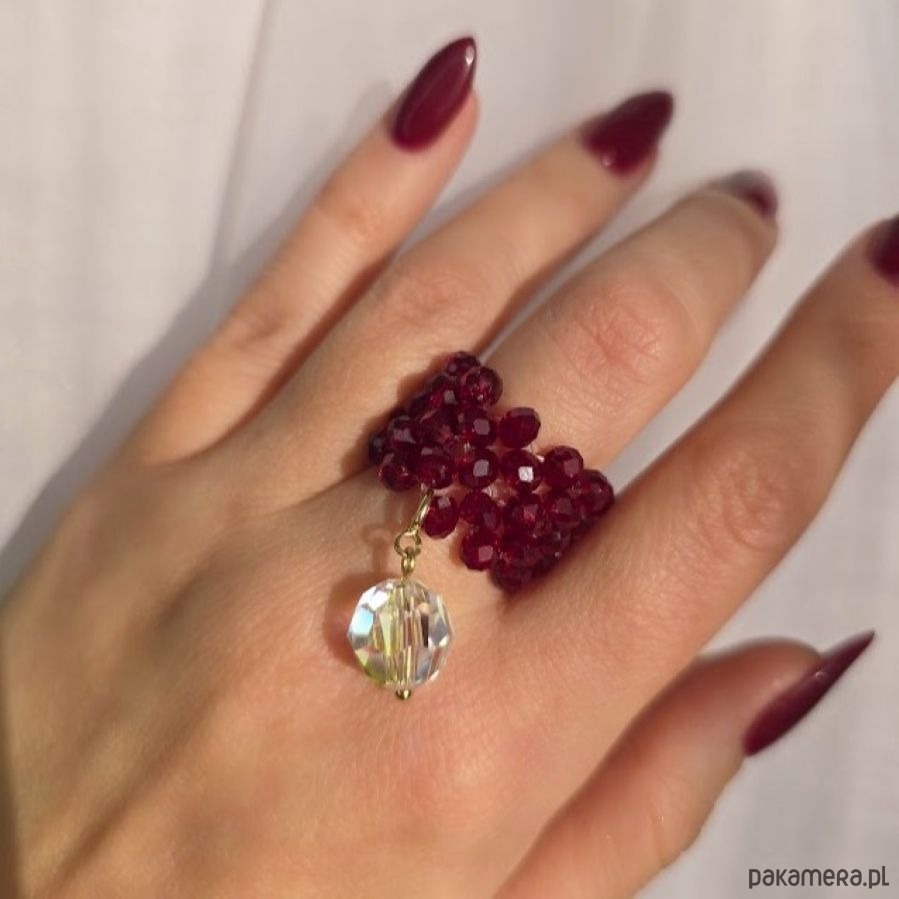 Pierścionek 5-rzędowy ze szkła kryształowego w kolorze burgundowym, z ozdobną zawieszką w postaci kulki Swarovski. Pierścionek wykonany jest w połączeniu z elementami stali szlachetnej oraz srebra 925 pozłacanego 24k złotem. Zawieszka dopinana jest do pierścionka za pomocą federinga, dzięki czemu pierścionek można nosić w wersji z zawieszką lub bez. Ręcznie pleciony pierścionek nawinięty jest na elastyczną, trwałą gumkę silikonową, dzięki czemu biżuteria dopasowuje się do palca.. Biżuteria błyszczy pod wpływem światła i prezentuje się okazale i stylowo.